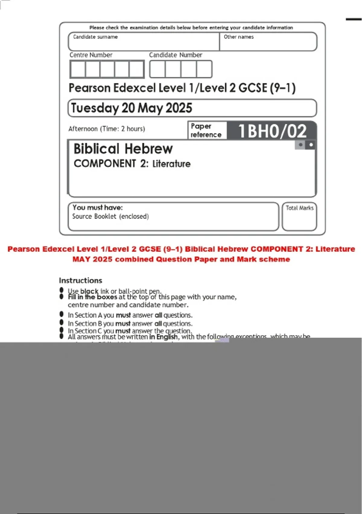 Pearson Edexcel Level 1/Level 2 GCSE (9–1) Biblical Hebrew COMPONENT 2: Literature MAY 2025 combined Question Paper and Mark scheme