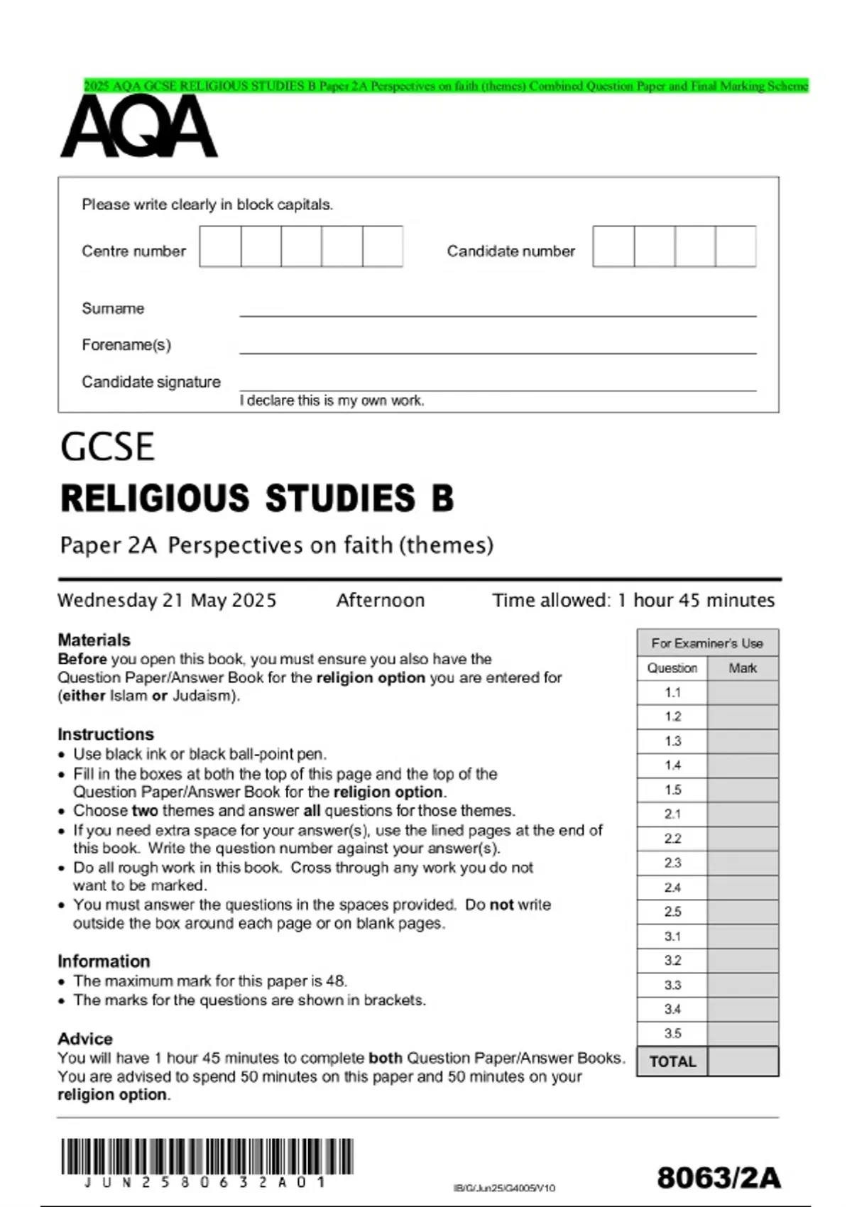 2025 AQA GCSE RELIGIOUS STUDIES B Paper 2A Perspectives on faith (themes) Combined Question Paper and Final Marking Scheme