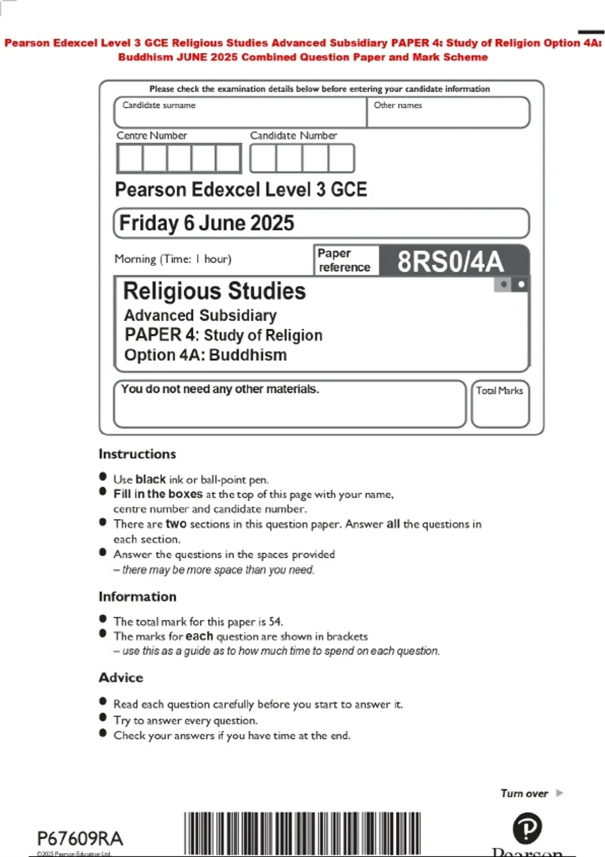 Pearson Edexcel Level 3 GCE Religious Studies Advanced Subsidiary PAPER 4: Study of Religion Option 4A: Buddhism JUNE 2025 Combined Question Paper and Mark Scheme