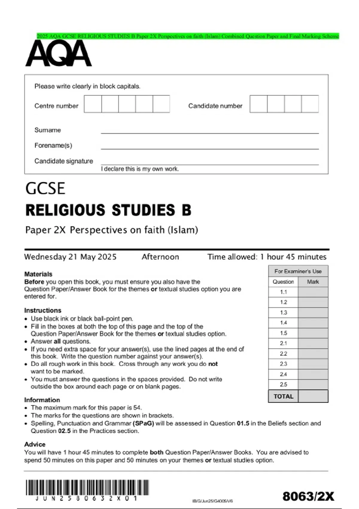 2025 AQA GCSE RELIGIOUS STUDIES B Paper 2X Perspectives on faith (Islam) Combined Question Paper and Final Marking Scheme