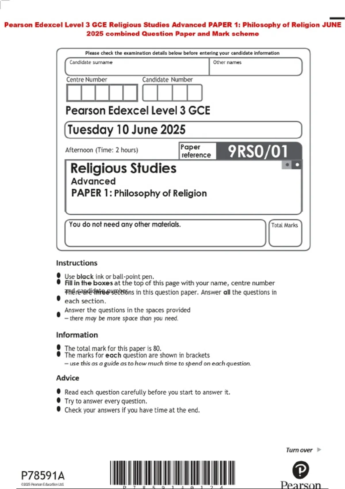 Pearson Edexcel Level 3 GCE Religious Studies Advanced PAPER 1: Philosophy of Religion JUNE 2025 combined Question Paper and Mark scheme