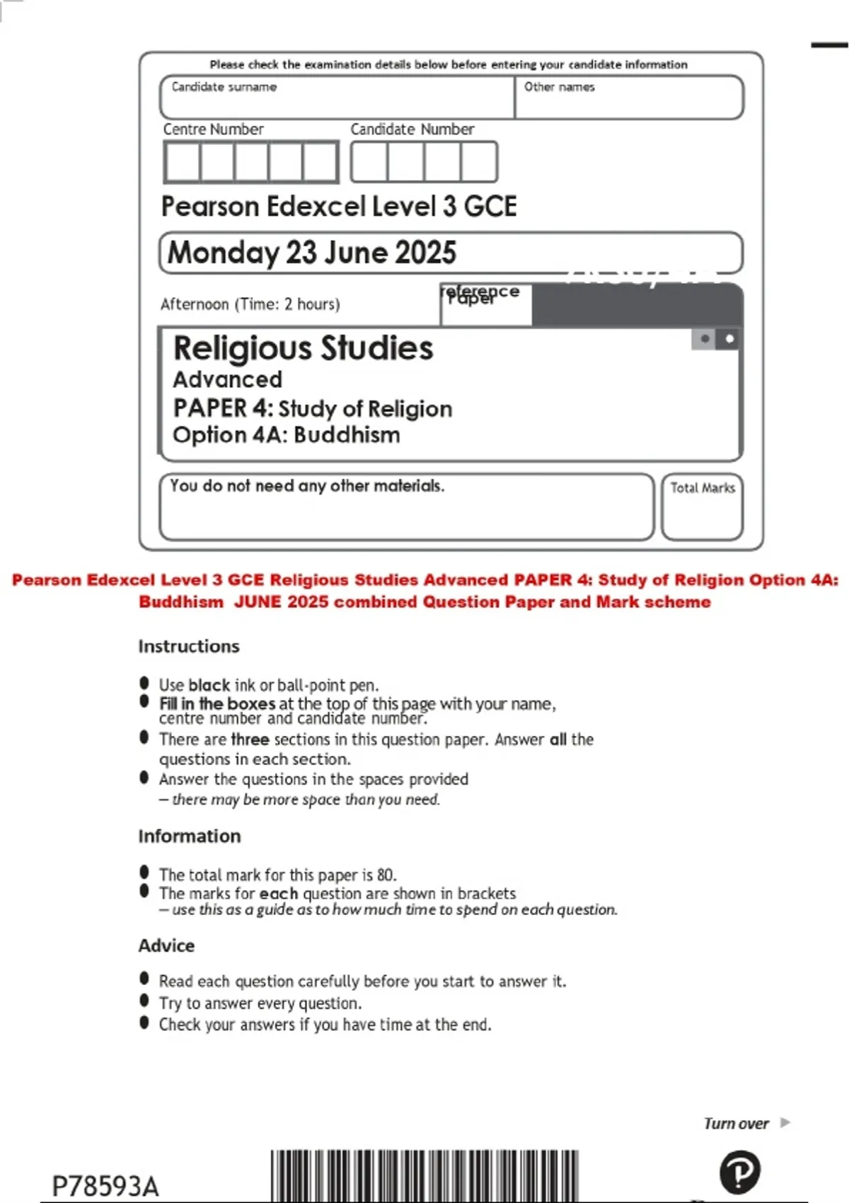 Pearson Edexcel Level 3 GCE Religious Studies Advanced PAPER 4: Study of Religion Option 4A: Buddhism JUNE 2025 combined Question Paper and Mark scheme