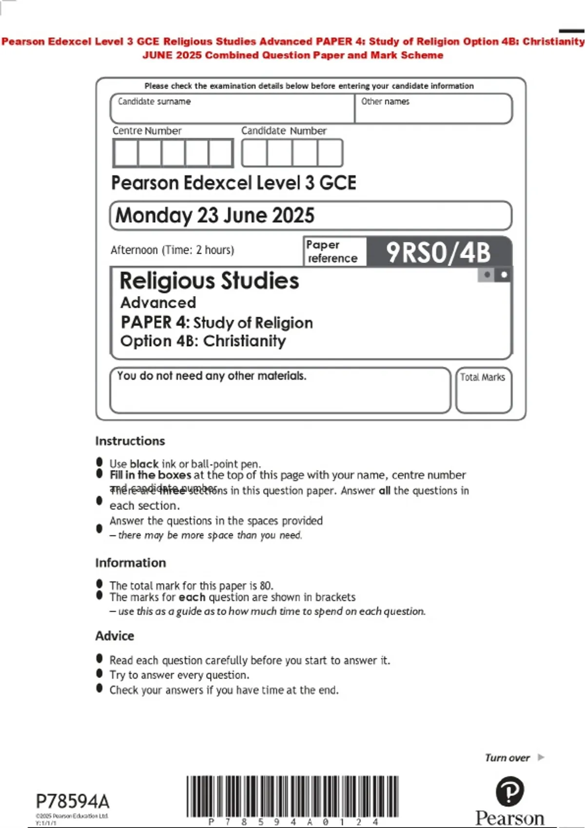 Pearson Edexcel Level 3 GCE Religious Studies Advanced PAPER 4: Study of Religion Option 4B: Christianity JUNE 2025 Combined Question Paper and Mark Scheme