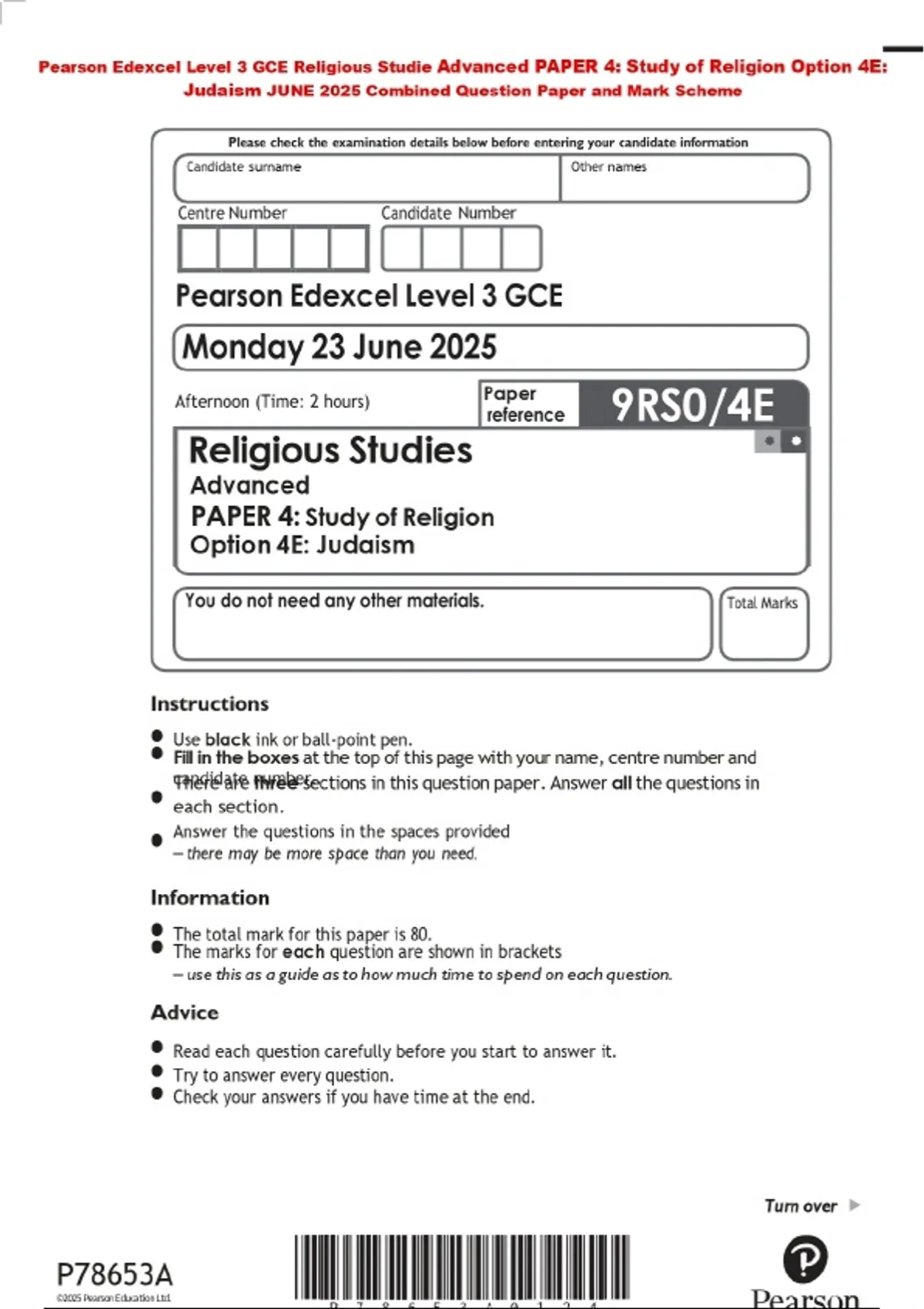 Pearson Edexcel Level 3 GCE Religious Studie Advanced PAPER 4: Study of Religion Option 4E: Judaism JUNE 2025 Combined Question Paper and Mark Scheme