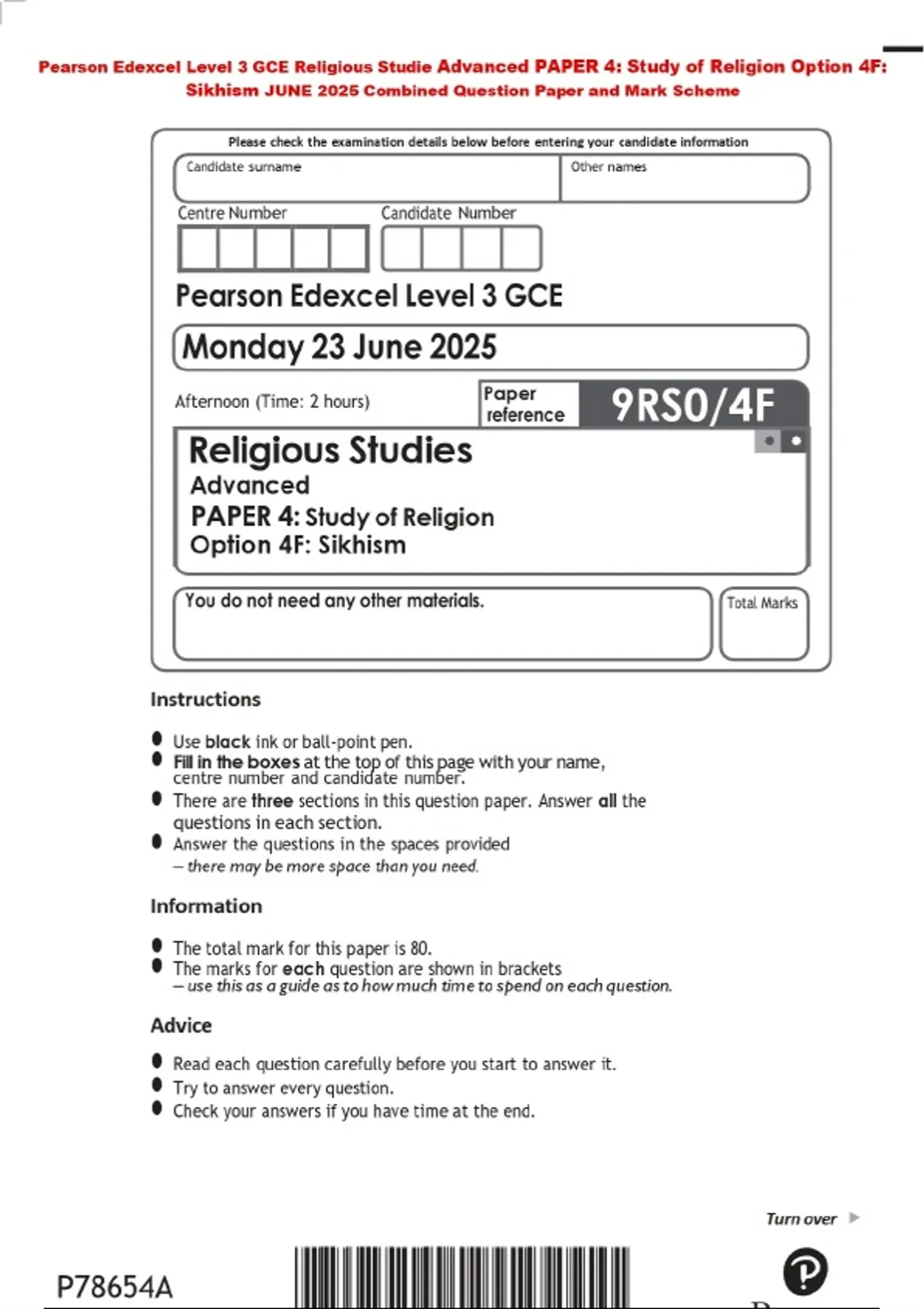Pearson Edexcel Level 3 GCE Religious Studie Advanced PAPER 4: Study of Religion Option 4F: Sikhism JUNE 2025 Combined Question Paper and Mark Scheme