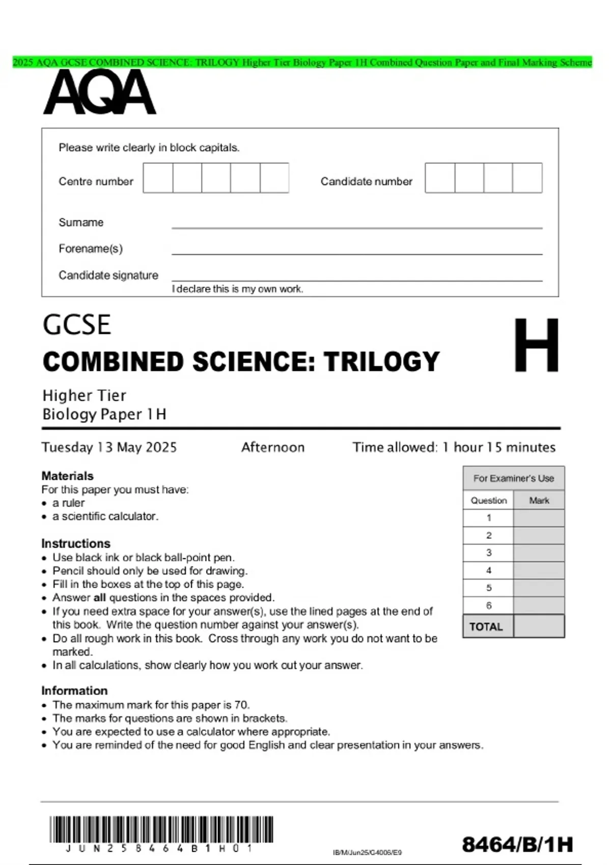 2025 AQA GCSE COMBINED SCIENCE: TRILOGY Higher Tier Biology Paper 1H Combined Question Paper and Final Marking Scheme