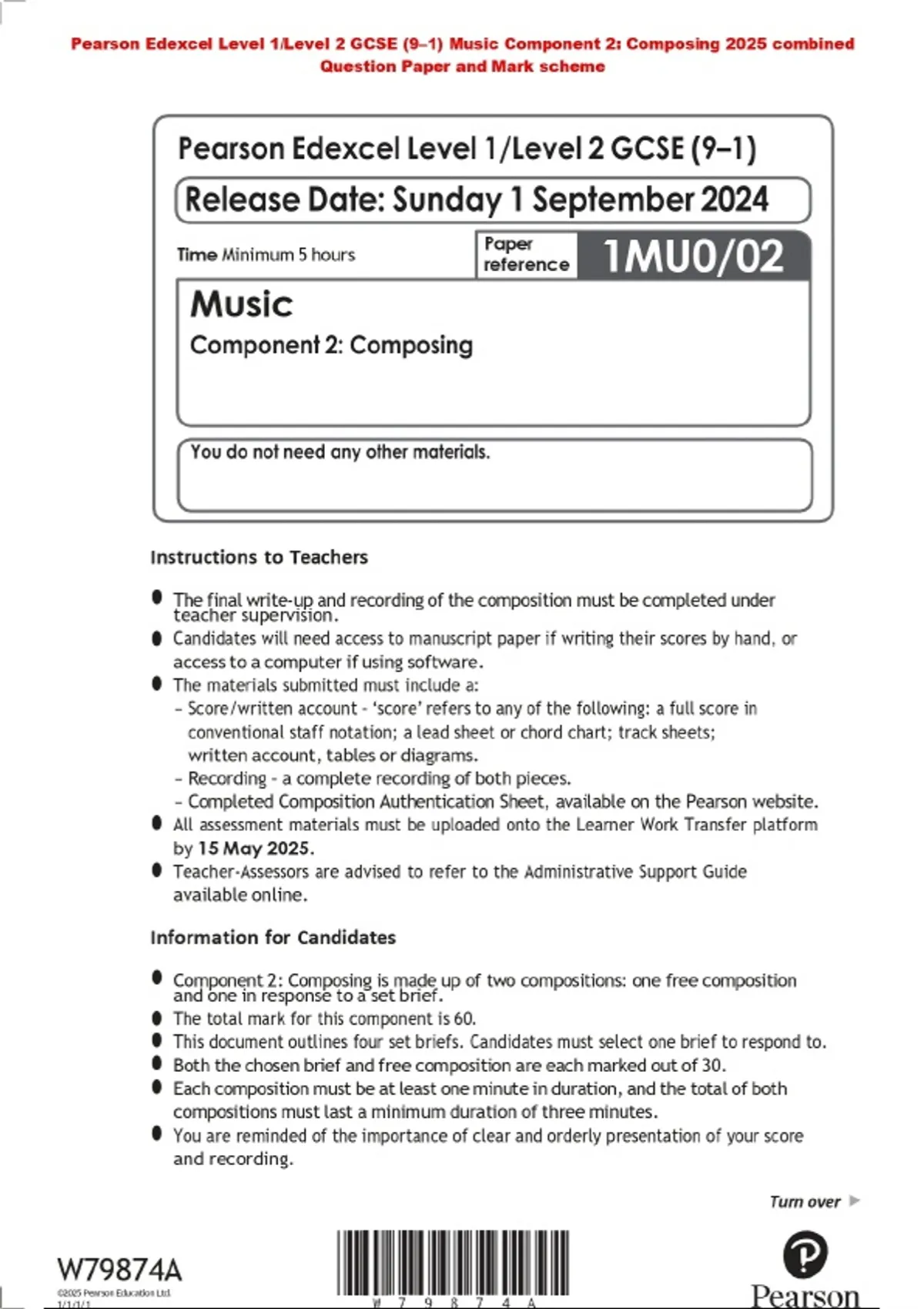 Pearson Edexcel Level 1/Level 2 GCSE (9–1) Music Component 2: Composing 2025 combined Question Paper