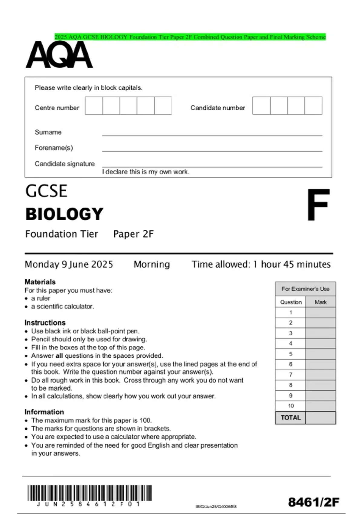 2025 AQA GCSE BIOLOGY Foundation Tier Paper 2F Combined Question Paper and Final Marking Scheme