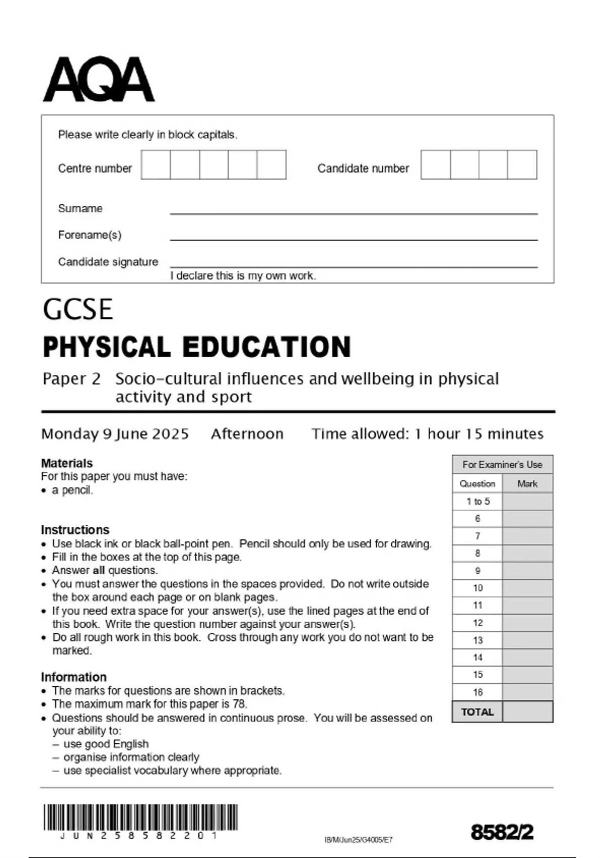 AQA Gcse Physical Education 8582/2 paper 2 2025 Question Paper