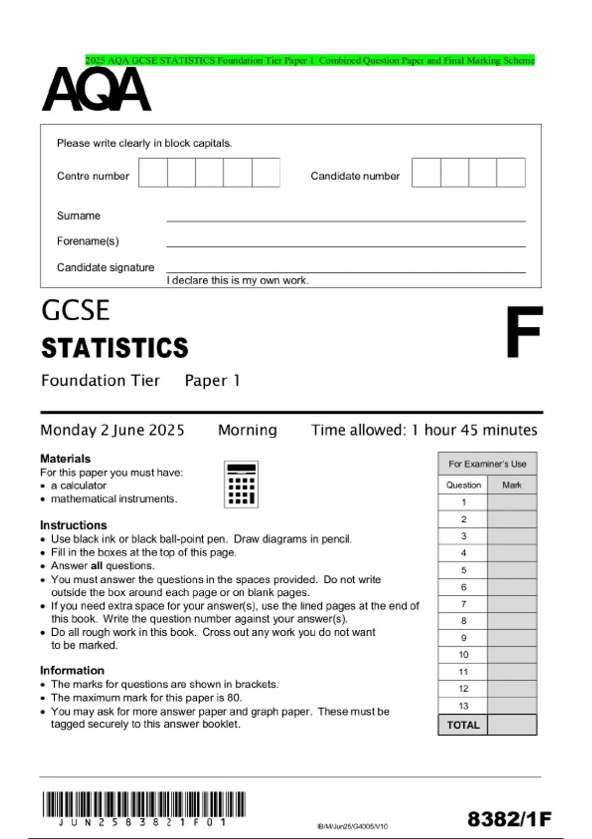 2025 AQA GCSE STATISTICS Foundation Tier Paper 1 Combined Question Paper and Final Marking Scheme
