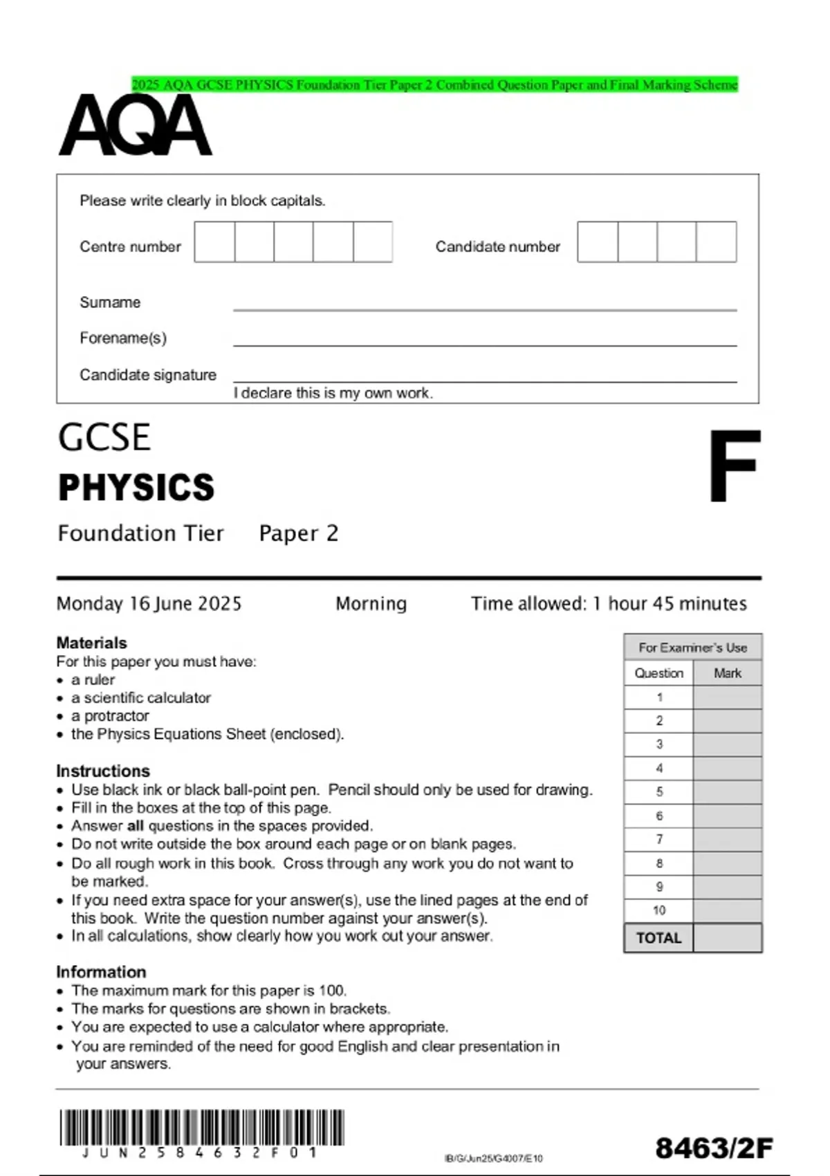 2025 AQA GCSE PHYSICS Foundation Tier Paper 2 Combined Question Paper and Final Marking Scheme