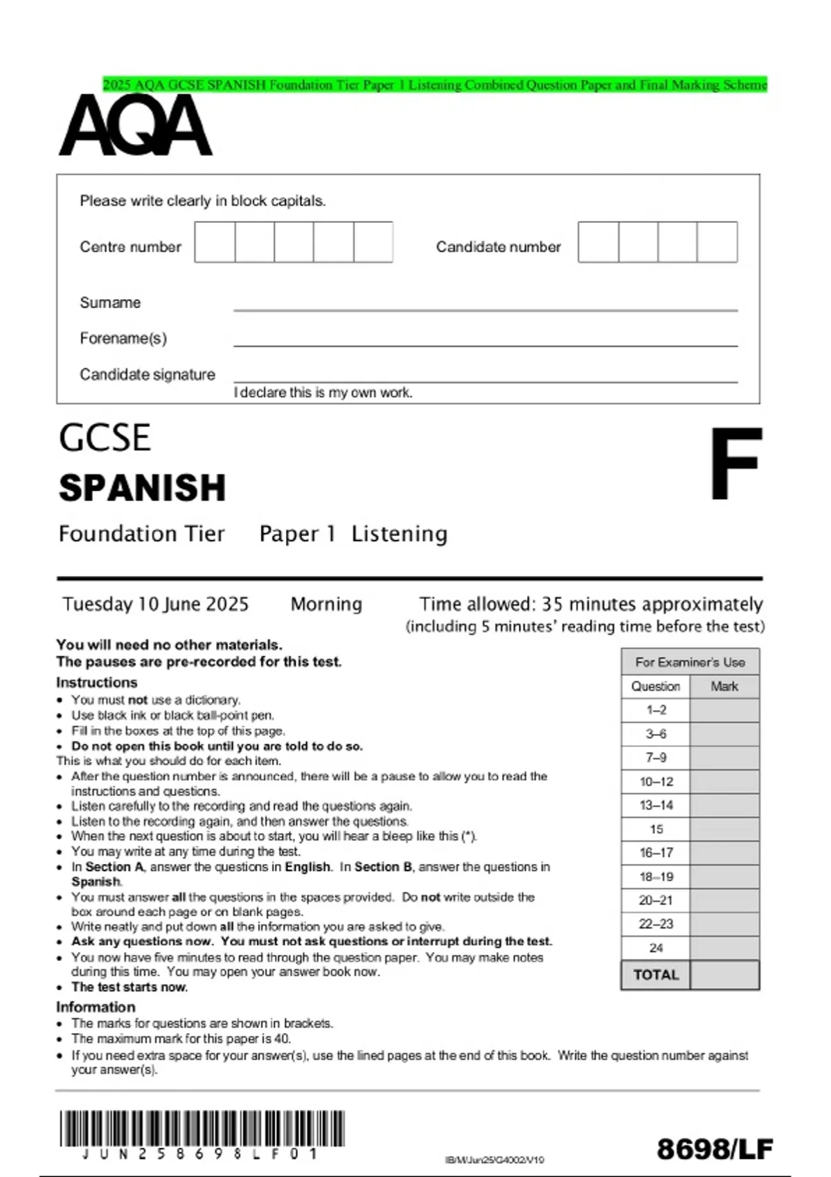 2025 AQA GCSE SPANISH Foundation Tier Paper 1 Listening Combined Question Paper and Final Marking Scheme