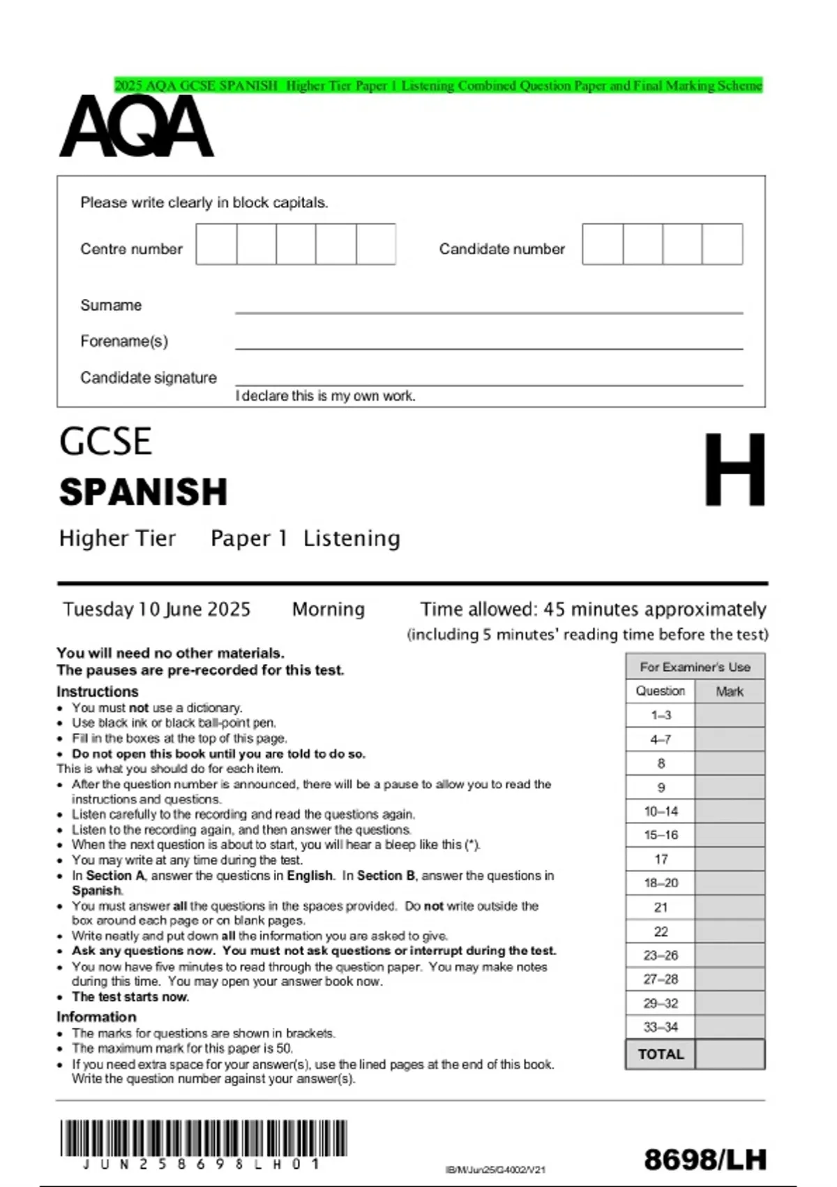 2025 AQA GCSE SPANISH Higher Tier Paper 1 Listening Combined Question Paper and Final Marking Scheme