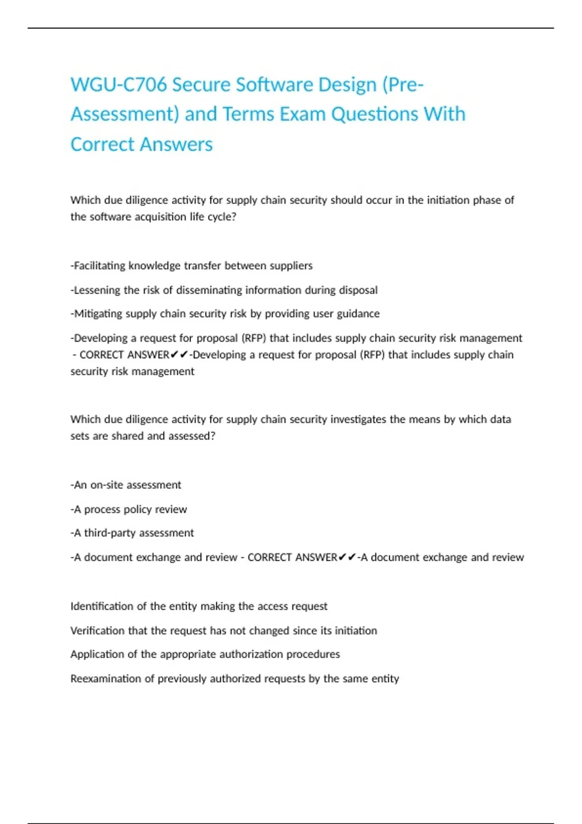 WGU-C706 Secure Software Design (Pre-Assessment) and Terms Exam Questions With Correct Answers