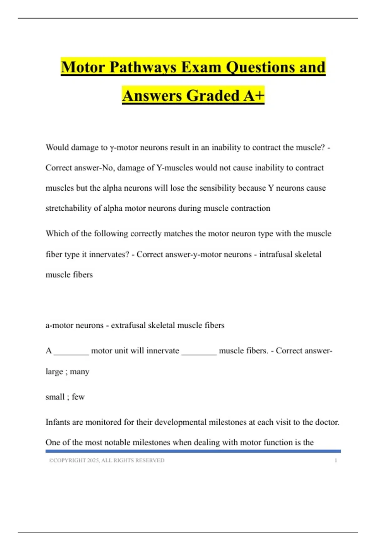 Motor Pathways Exam Questions and Answers Graded A+