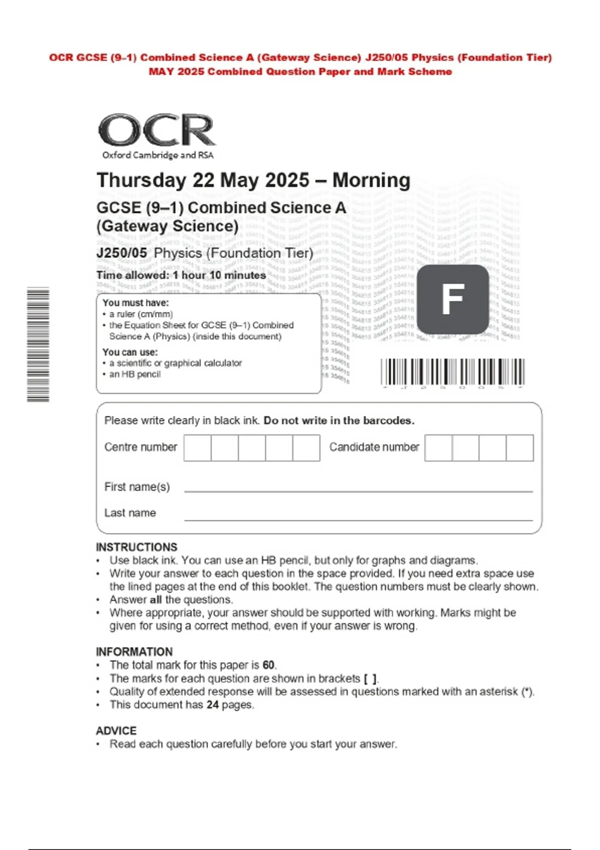 OCR GCSE (9–1) Combined Science A (Gateway Science) J250/05 Physics (Foundation Tier) MAY 2025 Combined Question Paper and Mark Scheme