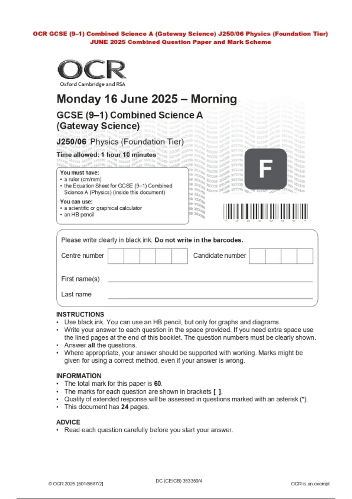 OCR GCSE (9–1) Combined Science A (Gateway Science) J250/06 Physics (Foundation Tier) JUNE 2025 Combined Question Paper and Mark Scheme