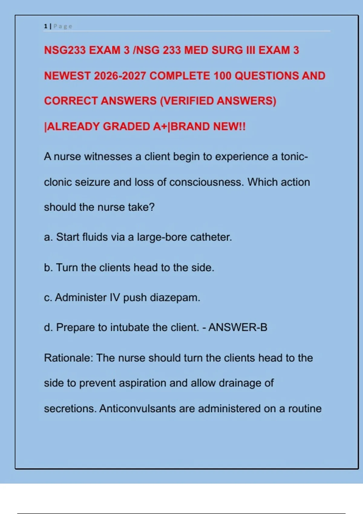 d. Prepare to intubate the client. - ANSWER-B