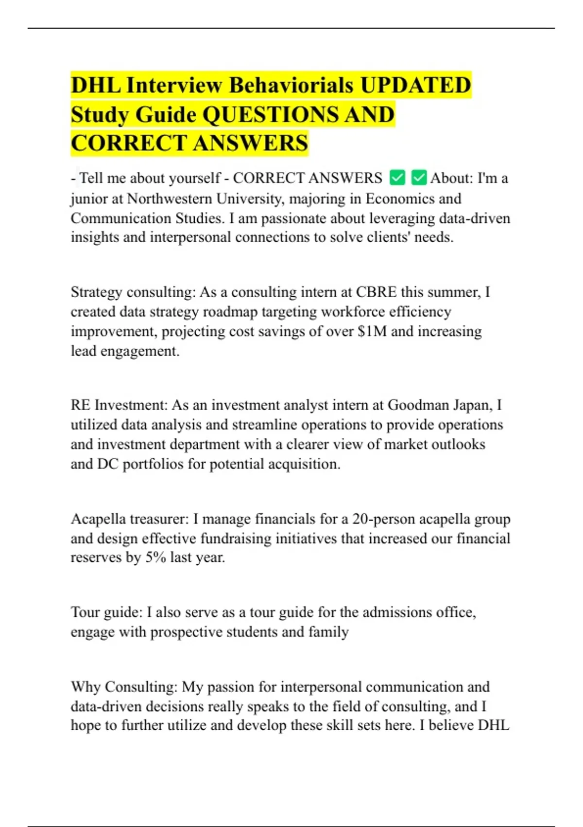 DHL Interview Behaviorials UPDATED Study Guide QUESTIONS AND CORRECT ANSWERS - Tell me about yourself - CORRECT ANSWERS About: I'm a junior at Northwestern University, majoring in Economics and Communication Studies. I am passionate about leveraging data-driven