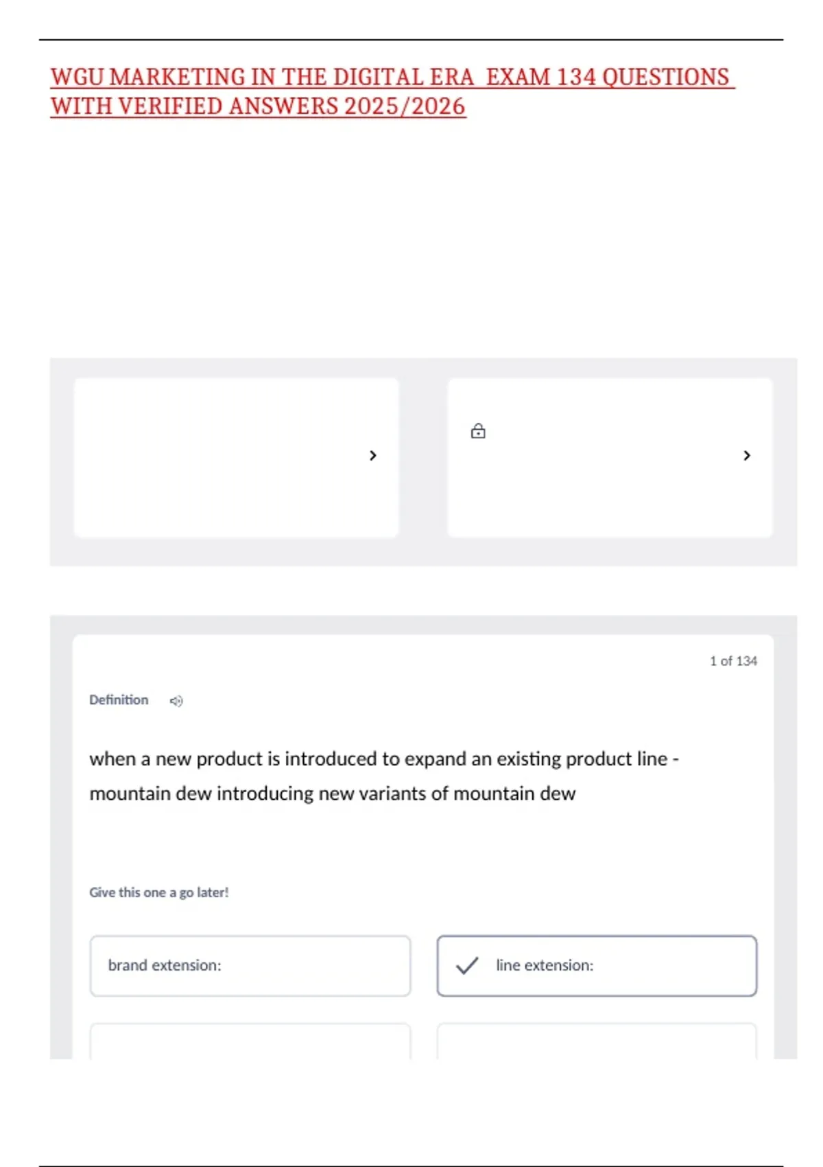 WGU MARKETING IN THE DIGITAL ERA EXAM 134 QUESTIONS WITH VERIFIED ANSWERS 2025/2026 when a new product is introduced to expand an existing product line - mountain dew introducing new variants of mountain dew the real and perceived value that a brand brings to the organization collabs where two or more brands benefit by serving a common or similar customer (Doritos and Taco Bell - Doritos locos taco) weaving the narrative of the brand - the why, the purpose, the reason - with emotions and feelings that entice people to follow or care about a brand beyond just the products and services it sells