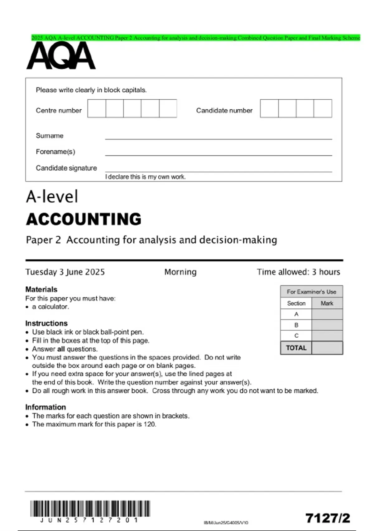 2025 AQA A-level ACCOUNTING Paper 2 Accounting for analysis and decision-making Combined Question Paper and Final Marking Scheme