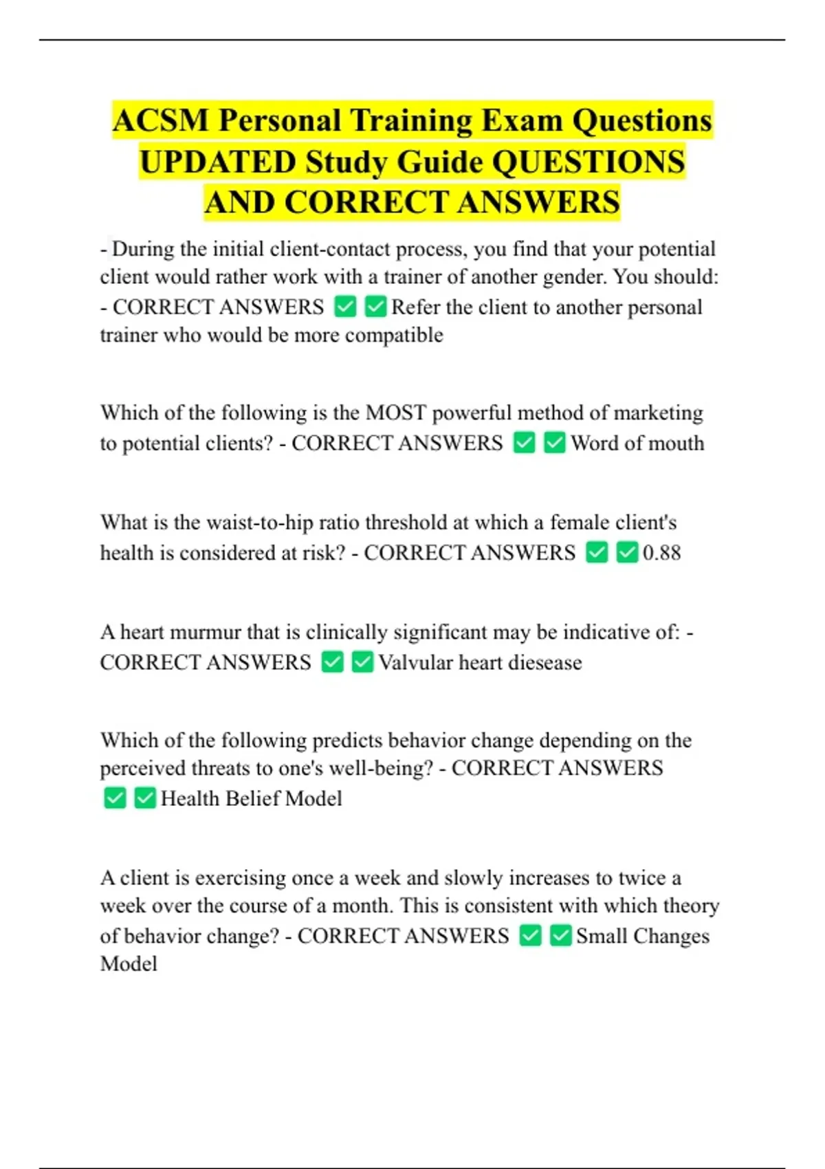 ACSM Personal Training Exam Questions UPDATED Study Guide QUESTIONS AND CORRECT ANSWERS
