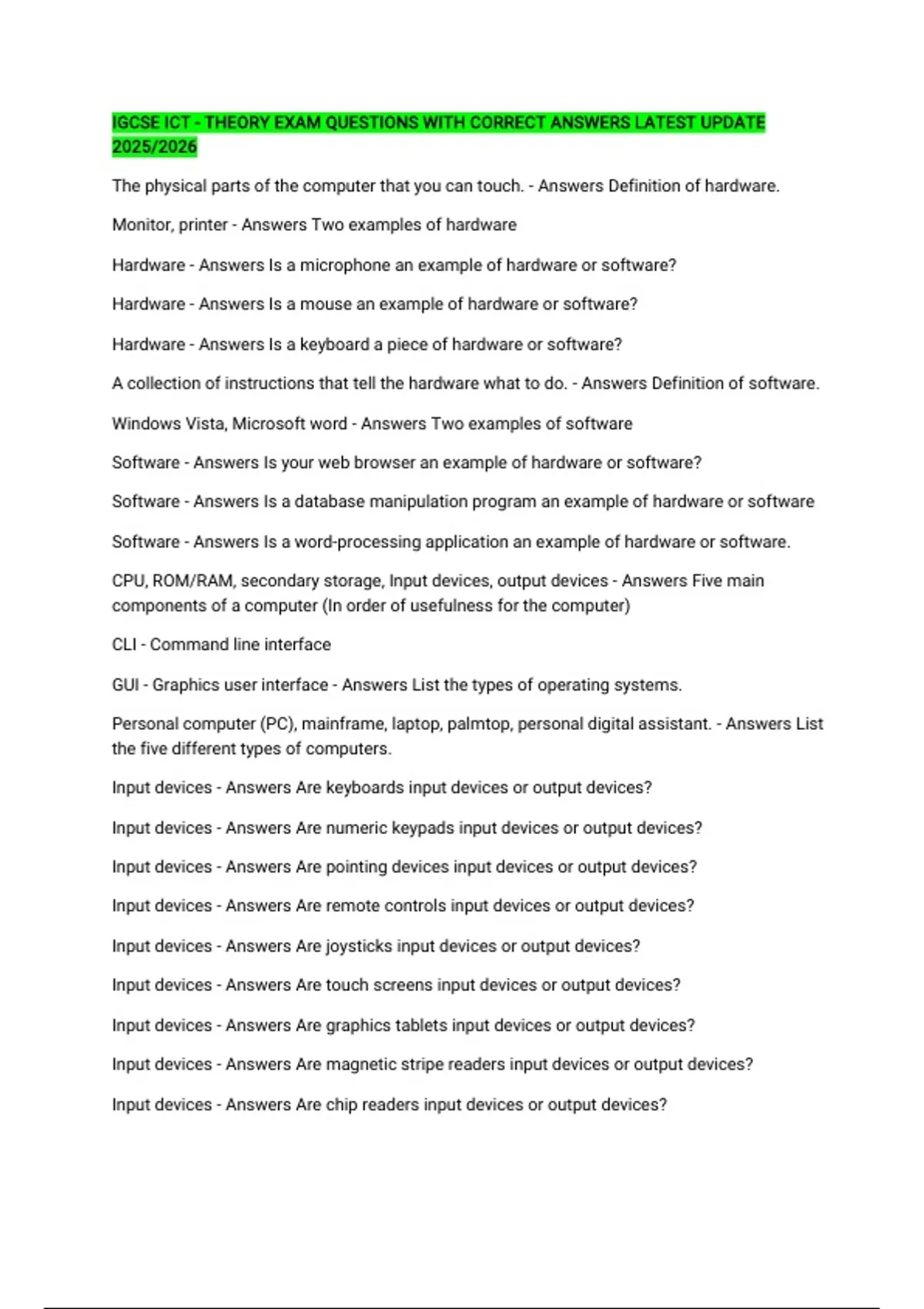 IGCSE ICT - THEORY EXAM QUESTIONS WITH CORRECT ANSWERS LATEST UPDATE 2025/2026 The physical parts of the computer that you can touch. - Answers Definition of hardware. Monitor, printer - Answers Two examples of hardware Hardware - Answers Is a microphone an example of hardware or software? Hardware - Answers Is a mouse an example of hardware or software? Hardware - Answers Is a keyboard a piece of hardware or software? A collection of instructions that tell the hardware what to do. - Answers Definition of software. Windows Vista, Microsoft word - Answers Two examples of software Software - Answers Is your web browser an example of hardware or software? Software - Answers Is a database manipulation program an example of hardware or software Software - Answers Is a word-processing application an example of hardware or software. CPU, ROM/RAM, secondary storage, Input devices, output devices - Answers Five main components of a computer (In order of usefulness for the computer) CLI - Command line interface GUI - Graphics user interface - Answers List the types of operating systems. Personal computer (PC), mainframe, laptop, palmtop, personal digital assistant. - Answers List the five different types of computers. Input devices - Answers Are keyboards input devices or output devices? Input devices - Answers Are numeric keypads input devices or output devices? Input devices - Answers Are pointing devices input devices or output devices? Input devices - Answers Are remote controls input devices or output devices? Input devices - Answers Are joysticks input devices or output devices? Input devices - Answers Are touch screens input devices or output devices? Input devices - Answers Are graphics tablets input devices or output devices? Input devices - Answers Are magnetic stripe readers input devices or output devices? Input devices - Answers Are chip readers input devices or output devices? Input devices - Answers Are PIN pads input devices or output devices? Input devices - Answers Are digital cameras input devices or output devices? Input devices - Answers Are video cameras input devices or output devices?