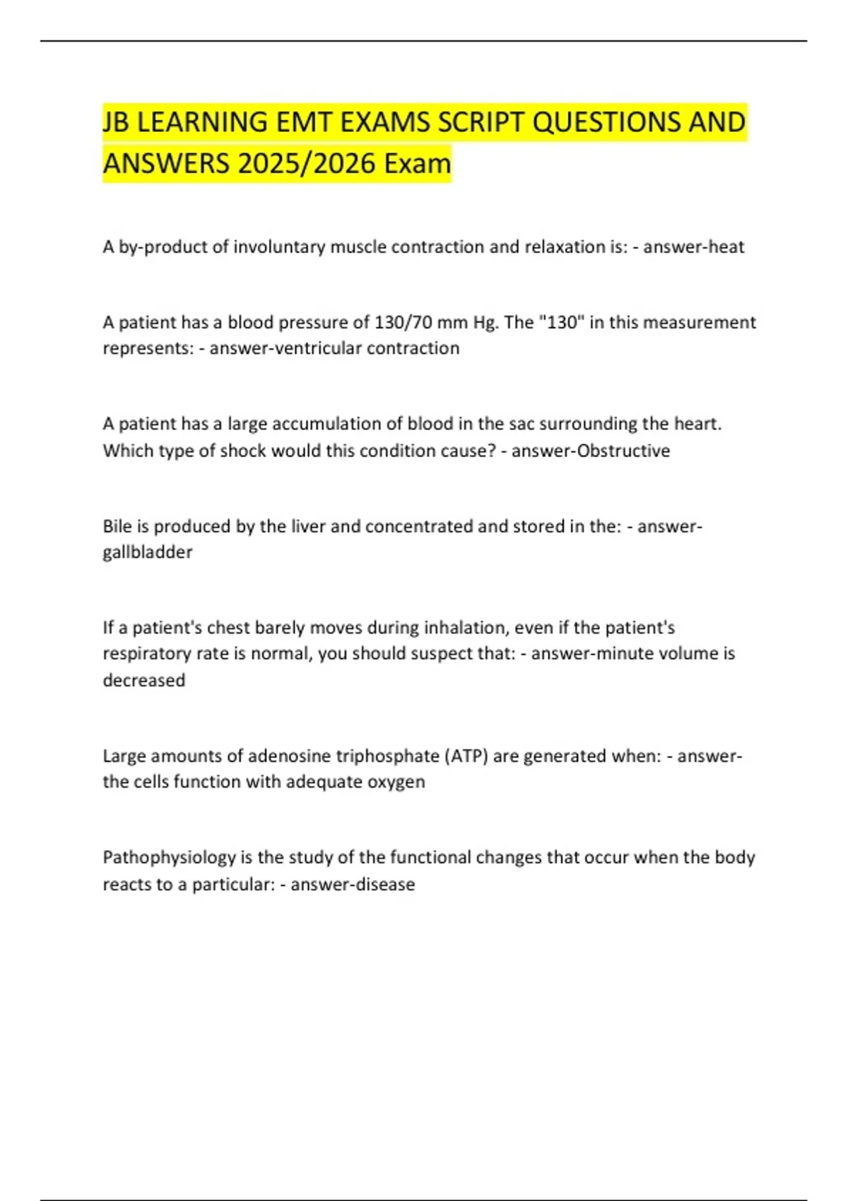 JB LEARNING EMT EXAMS SCRIPT QUESTIONS AND ANSWERS 2025/2026 Exam