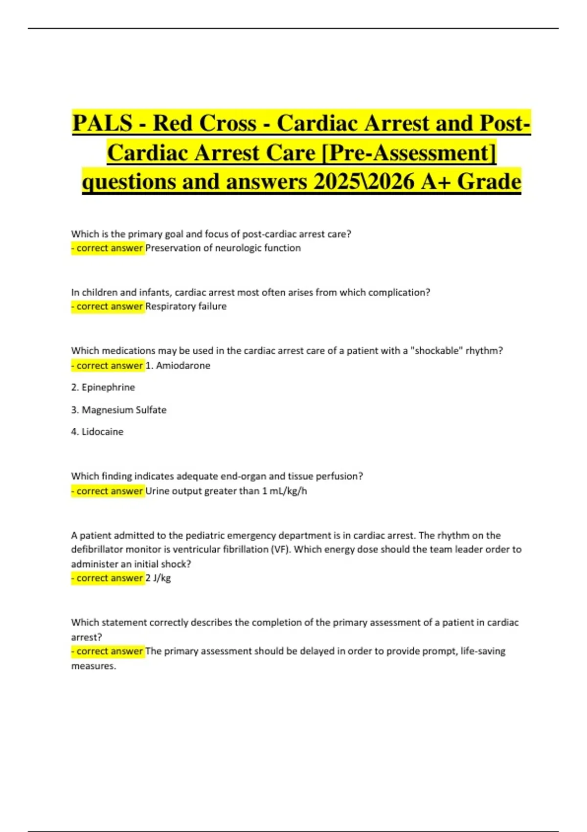 PALS – Red Cross Pre‑Assessment: Cardiac Arrest & Post‑Cardiac Arrest Care | Verified Questions & Correct Detailed Answers | Latest A+ Grade | 2025/2026 Edition