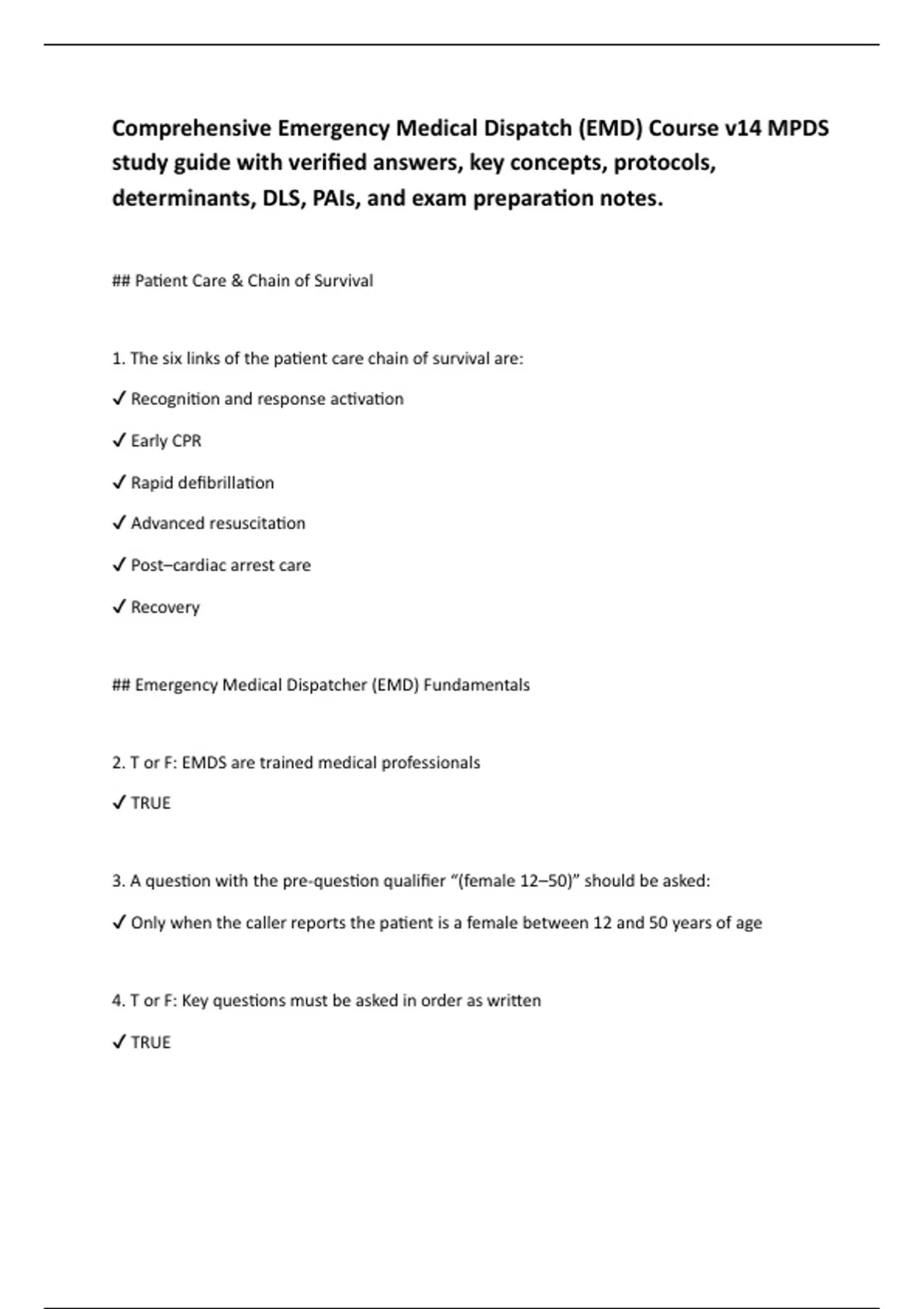 Emergency Medical Dispatch (EMD) Course v14 study notes covering MPDS structure, chief complaint protocols, key questions, determinant levels, dispatch life support, and pre-arrival instructions. Designed to support EMD students and emergency dispatch trainees with clear explanations and exam-oriented revision material.