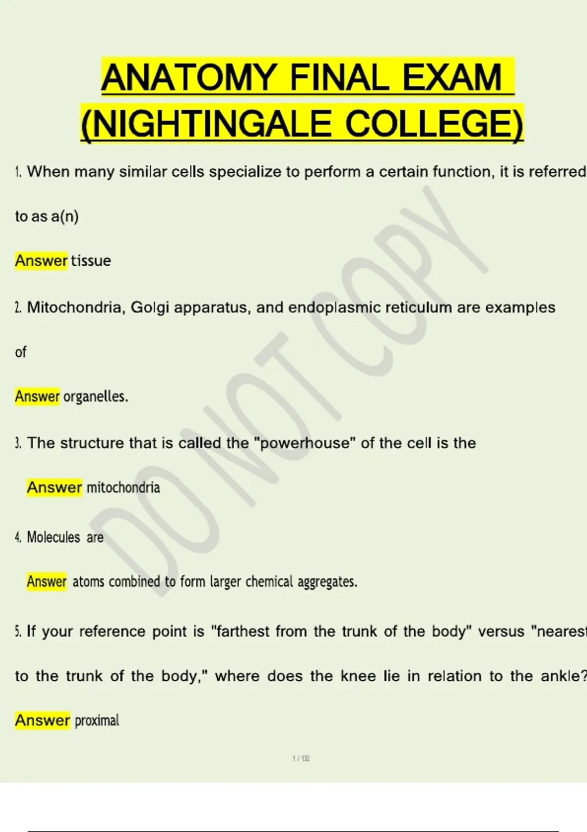 This document contains a comprehensive anatomy final exam used at Nightingale College, covering essential human anatomy topics assessed at the end of the course. The material is suitable for exam preparation and review, helping students test their understanding of anatomical structures, systems, terminology, and applied concepts commonly included in nursing and healthcare programs.