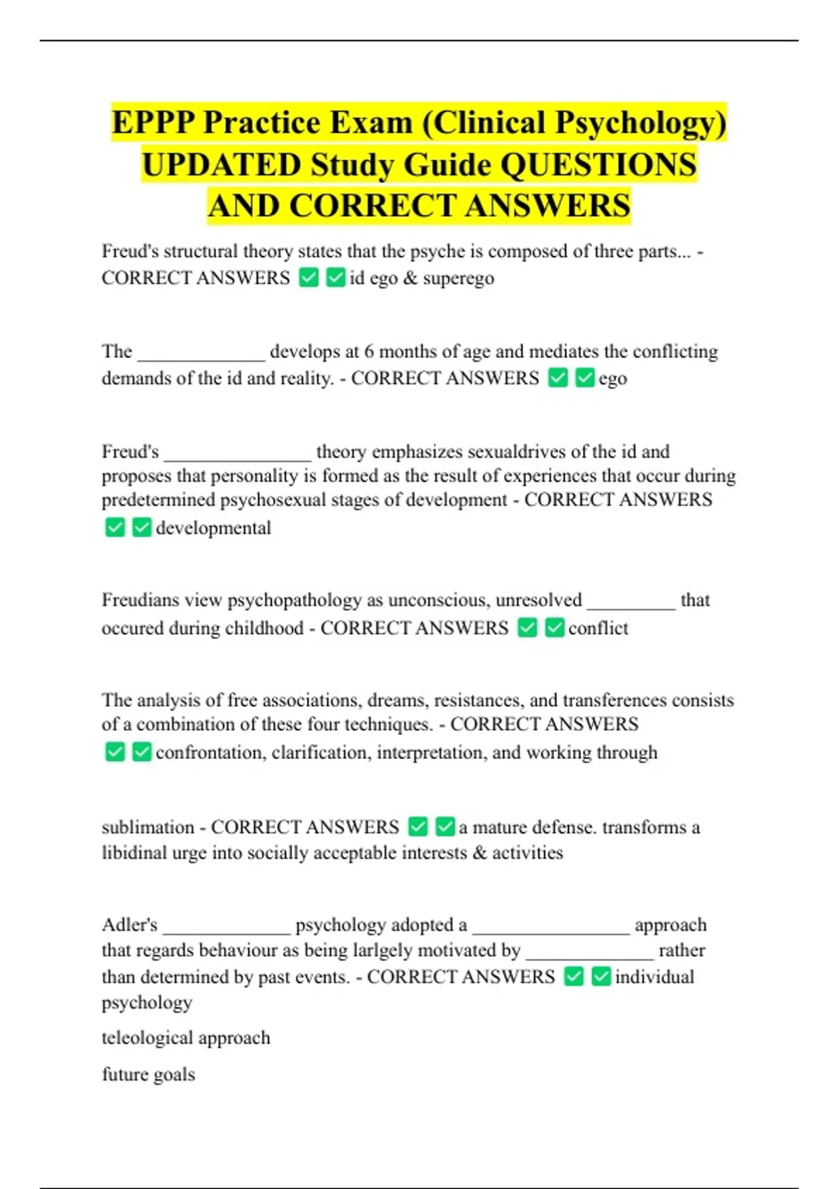 EPPP Practice Exam (Clinical Psychology) UPDATED Study Guide QUESTIONS AND CORRECT ANSWERS Freud's structural theory states that the psyche is composed of three parts... - CORRECT ANSWERS id ego & superego