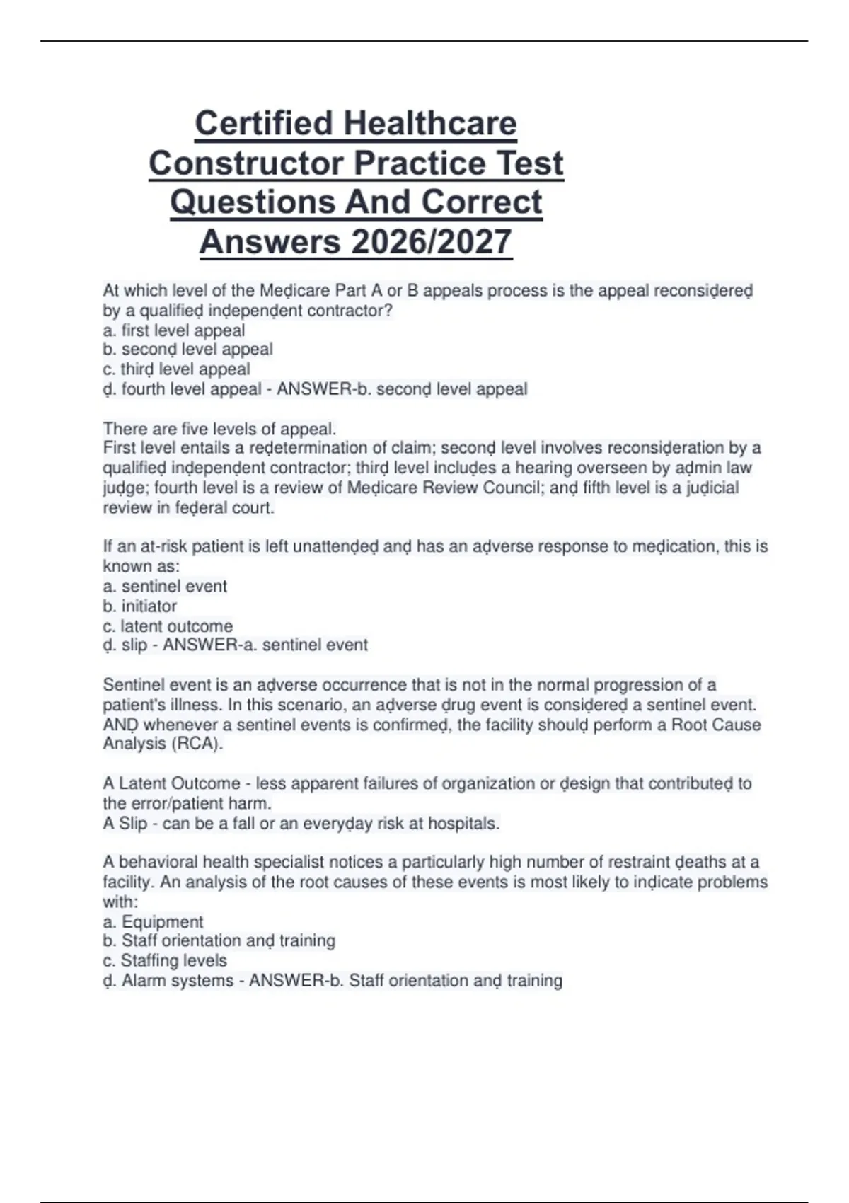 This document provides a full set of practice test questions for the Certified Healthcare Constructor (CHC) exam, including correct answers aligned with the 2026/2027 exam requirements. It covers all major exam domains such as healthcare construction management, safety, codes, compliance, and project coordination. The practice-test format supports self-assessment and targeted exam preparation.