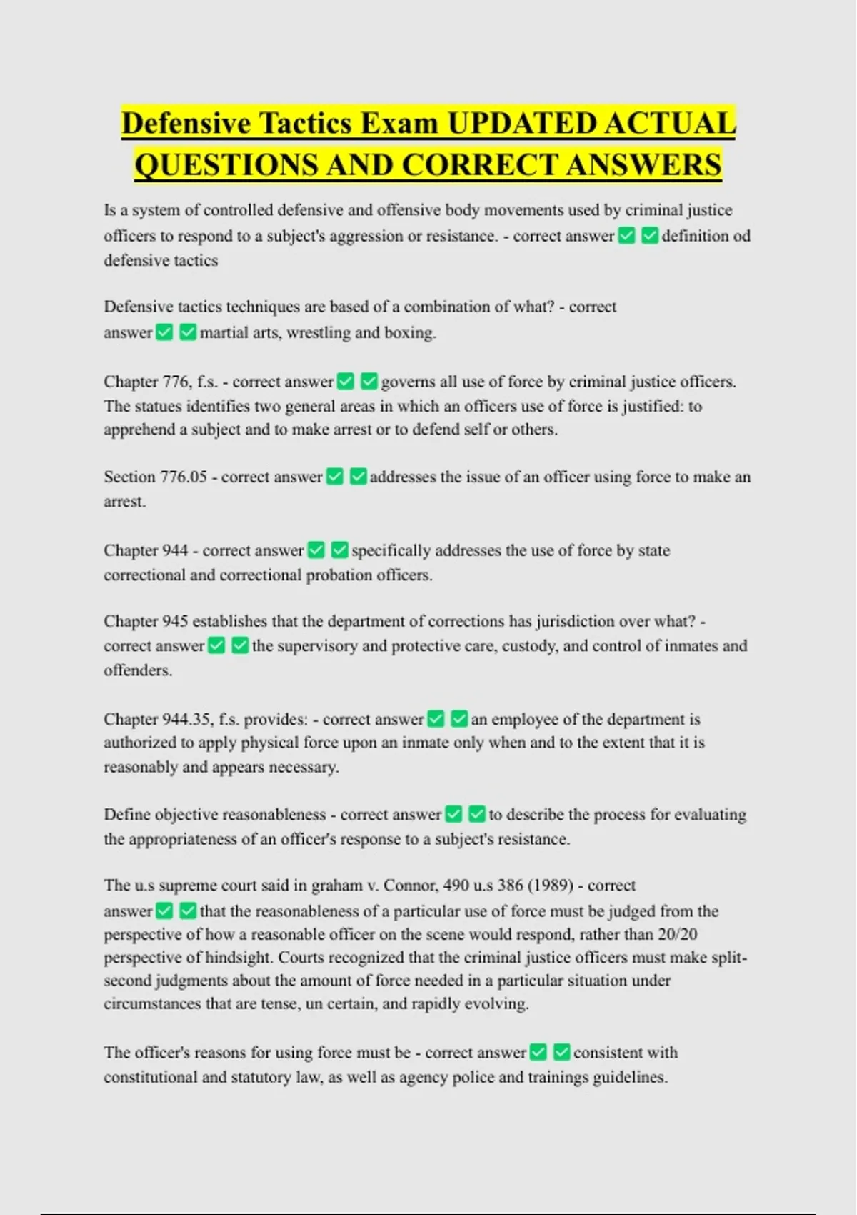 Defensive Tactics Exam UPDATED ACTUAL QUESTIONS AND CORRECT ANSWERS Is a system of controlled defensive and offensive body movements used by criminal justice officers to respond to a subject's aggression or resistance. - correct answer definition od defensive tactics Defensive tactics techniques are based of a combination of what? - correct answer martial arts, wrestling and boxing. Chapter 776, f.s. - correct answer governs all use of force by criminal justice officers. The statues identifies two general areas in which an officers use of force is justified: to apprehend a subject and to make arrest or to defend self or others. Section 776.05 - correct answer arrest. Chapter 944 - correct answer addresses the issue of an officer using force to make an specifically addresses the use of force by state correctional and correctional probation officers. Chapter 945 establishes that the department of corrections has jurisdiction over what? - correct answer the supervisory and protective care, custody, and control of inmates and offenders. Chapter 944.35, f.s. provides: - correct answer an employee of the department is authorized to apply physical force upon an inmate only when and to the extent that it is reasonably and appears necessary.