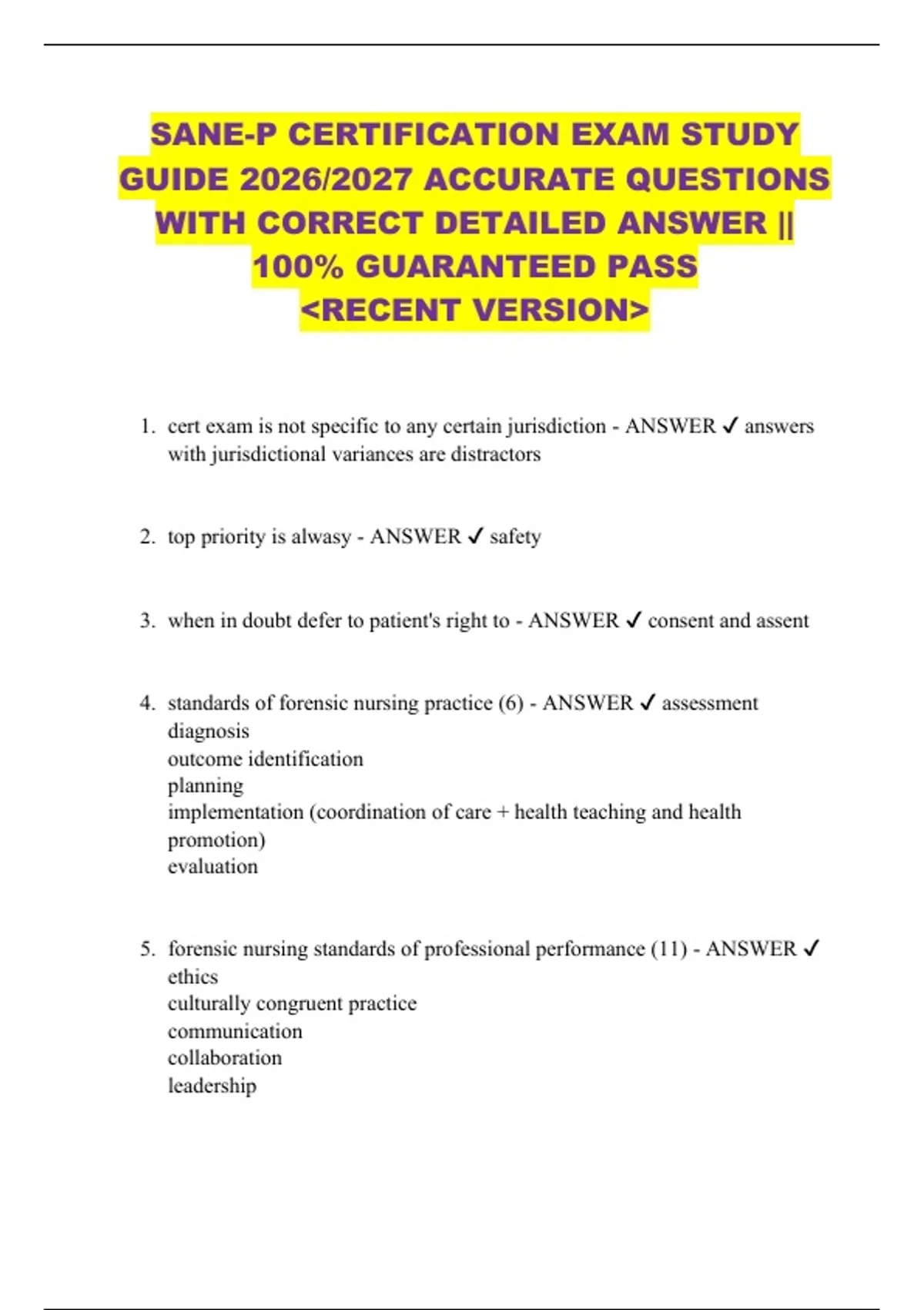SANE-P CERTIFICATION EXAM STUDY GUIDE 2026/2027 ACCURATE QUESTIONS WITH CORRECT DETAILED ANSWERS || 100% GUARANTEED PASS &lt;RECENT VERSION&gt; 1. cert exam is not specific to any certain jurisdiction - ANSWER answers with jurisdictional variances are distractors 2. top priority is alwasy - ANSWER safety 3. when in doubt defer to patient's right to - ANSWER consent and assent 4. standards of forensic nursing practice (6) - ANSWER assessment diagnosis outcome identification planning implementation (coordination of care + health teaching and health promotion) evaluation 5. forensic nursing standards of professional performance (11) - ANSWER ethics culturally congruent practice communication collaboration leadership education EBP and research quality of practice professional practice evaluation resource utilization environmental health 6. assessment - ANSWER collection of data...SANE must recognize the impact of the nurse's own values, attitudes, beliefs 7. diagnosis - ANSWER analyze the data obtained to determine actual diagnoses or potential risks...identify clinical findings and recognize normal variations vs abnormal 8. HIV S&S acute - ANSWER fever, myalgia, night sweats, fatigue headache, GI, pharyngitis, rash, weight loss, arthralgia 9. increases risk of HIV acquisition during SA - ANSWER trauma, multiple acts, ejaculation, no condom, concurrent STI, menstruation, HIV positive assailant with high viral load, from country/community with high prevalence 10. true or false: there is a standard recommendation for STI testing when a patient presents for treatment - ANSWER false 11. positive HIV status at time of testing after SA - ANSWER give PEP instead of nPEP 12. HIV negative status can - ANSWER provide legal implications esablishing confirmation that exposure was result of SA if seroconversaion occurs 13. before any STI treatment - ANSWER testing should be performed due to legal implications of positive results since treatment may interfere with diangosis of the STI 14. why is prophylaxis indicated in pubertal and not prepubertal - ANSWER risk of ascending infection + to prevent further potential transmission in adolescents also engaging in consensual sex 15. nPEP length of treatment - ANSWER 28 days 16. any delayed or missed doses of nPEP can cause - ANSWER treatment failure 17. The SANE is called to see a 4-yo patient brought to the ED by her mother with complaints of sexual abuse by a male relative. Which of the following answers best identifies an age-appropriate patient-centered approach? A. Get through the exam as quickly as possible. B. Don't explain each step of the exam process so as not to scare the chile. C. Ask a nonoffending parent/guardian to wait outside the room during the exam process. D. Limit exposure, ait times, and provide developmentally appropriate toys and distractions. - ANSWER D 18. a 10 yo male tells his mother that he is bleeding from his bottom. Later n the ED he discloses to his mother that his uncle has been sexually abusing him for the last five years. The SANE observes that his mother is upset. She keeps repeating, "This couldn't have happened or he would have told me sooner." Which of the following is most probable regarding the child's disclosure? A. This could not have happened since there is such a delay in the child's disclosure? B. The patient must only have disclosed because of the injuries today. C. This disclosure is consistent with a true disclosure of abuse. D. The mother is covering for the uncle and knew all along. - ANSWER C 19. A primary role of the pediatric SANE includes which of the following? A. Performing a forensic interview to get to important information to guide the SANE's medical examination. B. Performing an ethical, compassionate, and objective medical forensic examination. C. Performing a physical examination to confirm that sexual abuse has or has not occured. D. Performing a thorough forensic examination by analyzing clothing to find trace evidence. - ANSWER B 20. what factors place a child a increased risk for contracting an STD? - ANSWER * high incidence of STDs in the community • household member with an STD • perpetrator has an STD (even higher risk if the perpetrator has an open lesion) • perpetrator is in a high risk population: men who have sex with men, IV drug use, transgender, incarceration, sex work) • mucosal injury • mucosal contact with ejaculate • multiple perpetrators
