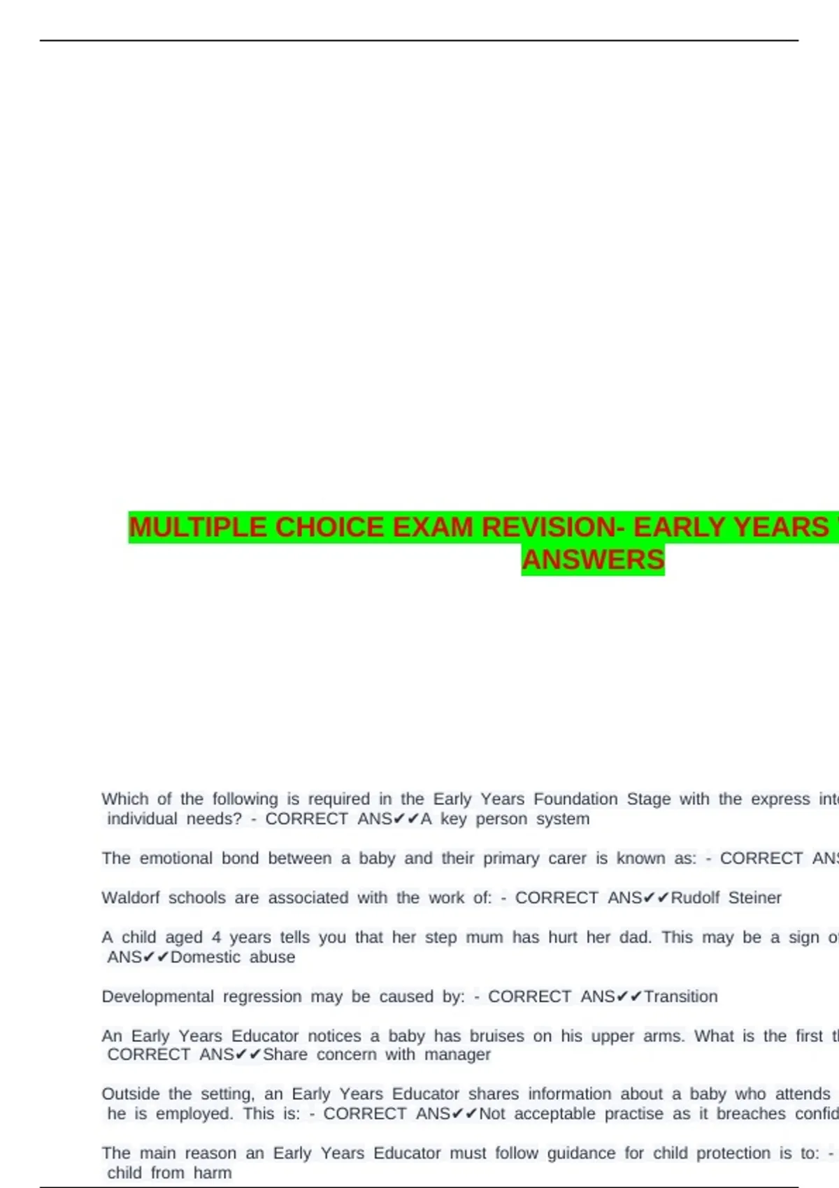 MULTIPLE CHOICE EXAM REVISION- EARLY YEARS WITH CORRECT ANSWERS