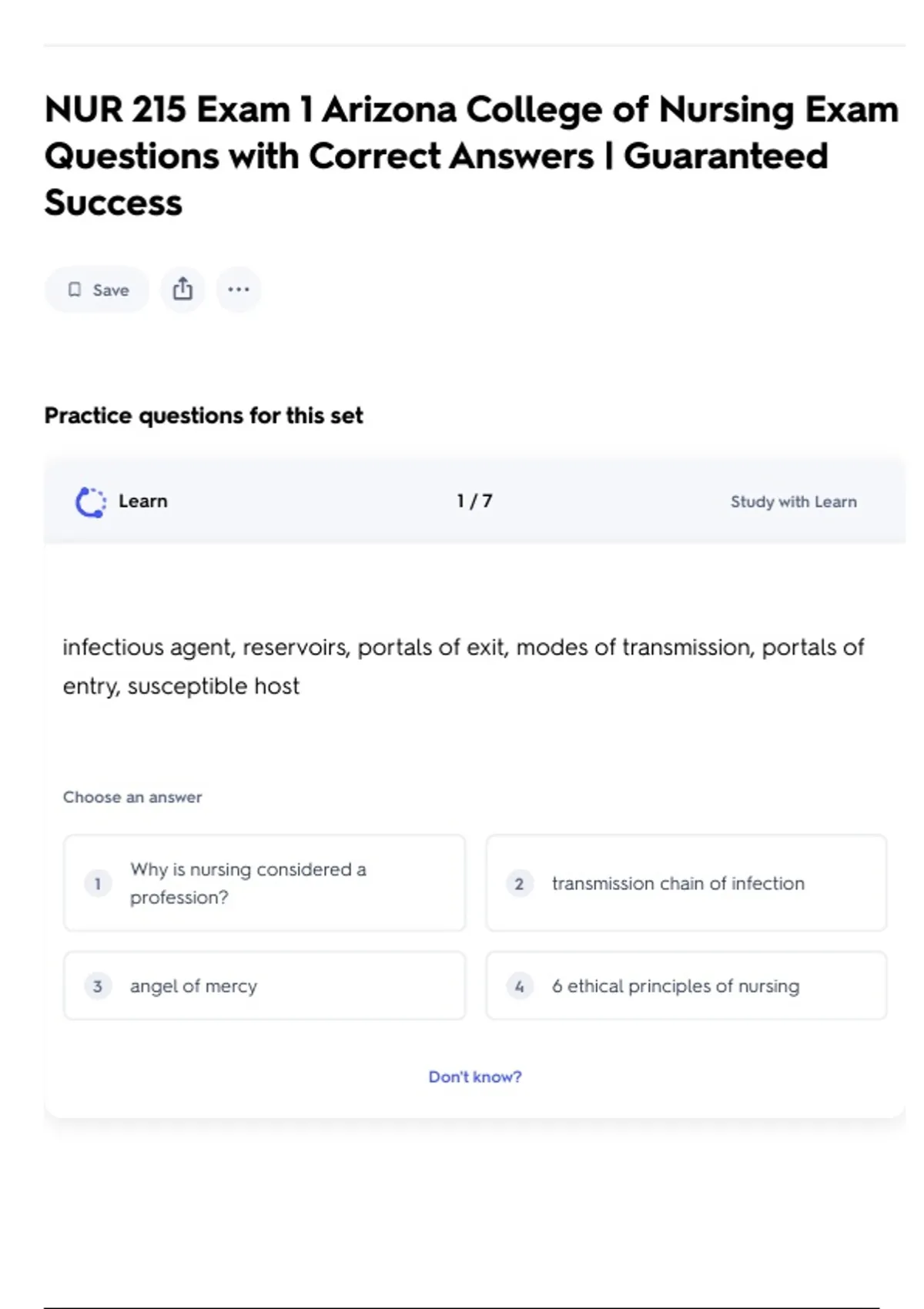NUR 215 Exam 1 Arizona College of Nursing Exam Questions with Correct Answers | Guaranteed Success