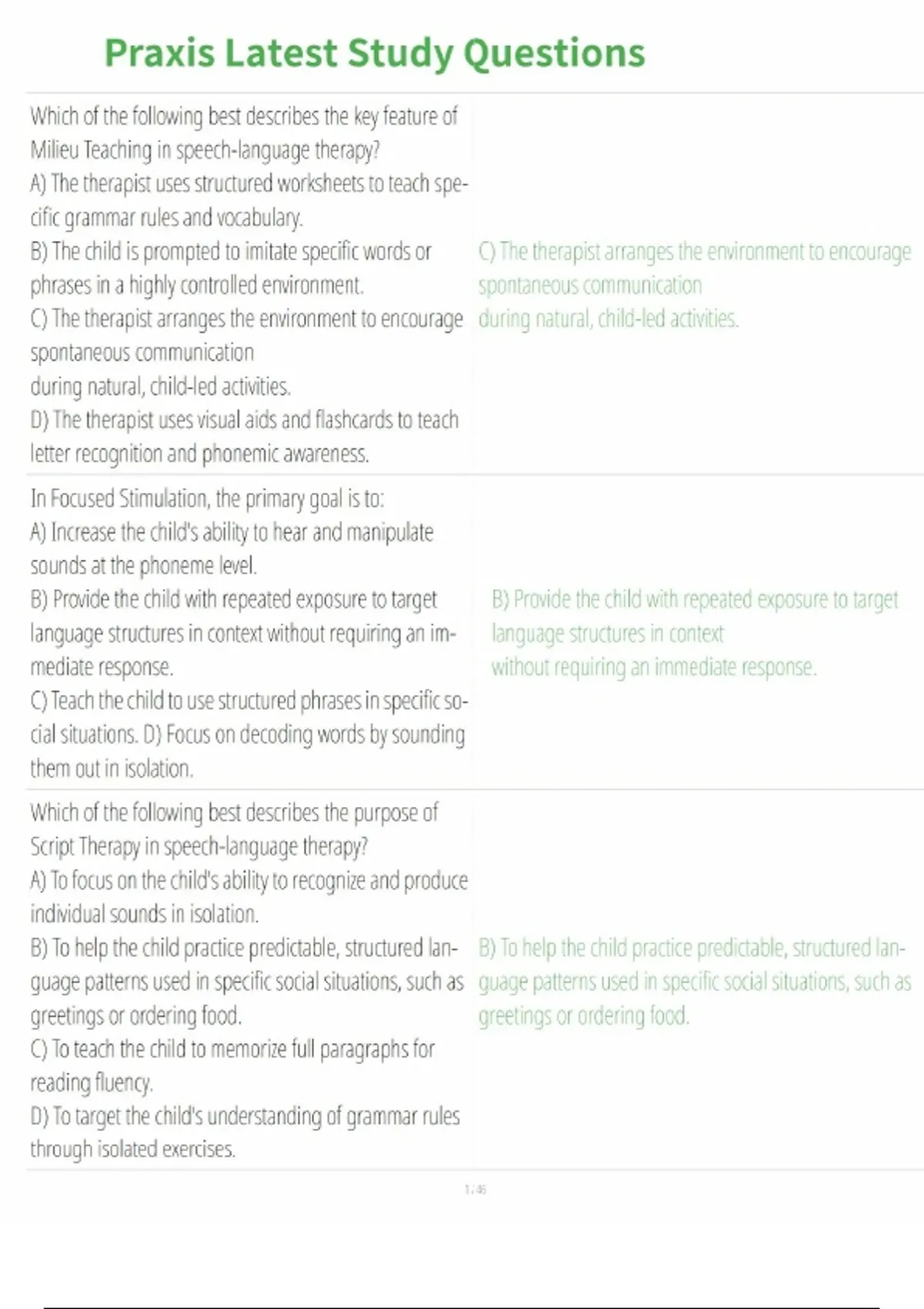 SLP - PRAXIS EXAM QUESTIONS AND 100% VERIFIED ANSWERS (COMPLETE SOLUTION) LATEST UPDATE 1. Which of the following best describes the key feature of Milieu Teaching in speech-language therapy? A) The therapist uses structured worksheets to teach specific grammar rules and vocabulary B) The child is prompted to imitate specific words or phrases in a highly controlled environment C) The therapist arranges the environment to encourage spontaneous communication during natural, child-led activities D) The therapist uses visual aids and flashcards to teach letter recognition and phonemic awareness.: C. Used in the naturalistic approach 2. In Focused Stimulation, the primary goal is to: A) Increase the child's ability to hear and manipulate sounds at the phoneme level B) Provide the child with repeated exposure to target language structures in context without requiring an immediate response. C) Teach the child to use structured phrases in specific social situations. D) Focus on decoding words by sounding them out in isolation.: B 3. Which of the following best describes the purpose of Script Therapy in speech-language therapy? A) To focus on the child's ability to recognize and produce individual sounds in isolation. B) To help the child practice predictable, structured language patterns used in specific social situations, such as greetings or ordering food. C) To teach the child to memorize full paragraphs for reading fluency. D) To target the child's understanding of grammar rules through isolated exercises.: B. 4. Which of the following is an example of Print Awareness? A) A child is able to segment the sounds in the word "dog" (/d/ /o/ /g/). B) A child points to the front cover of a book and understands that it contains the title and the author. C) A child can blend the sounds /k/ /æ/ /t/ to form the word "cat." D) A child can identify the first sound in the word "tree" as /t/.: B 5. Emily is practicing manipulating sounds. She is able to change the first sound in the word "dog" from /d/ to /b/, making the word "bog. "What aspect of Phonemic Awareness is Emily working on? A) Rhyming B) Sound Substitution C) Sound Blending D) Segmenting: B 6. Which of the following is a key characteristic of stuttering but not cluttering? ....
