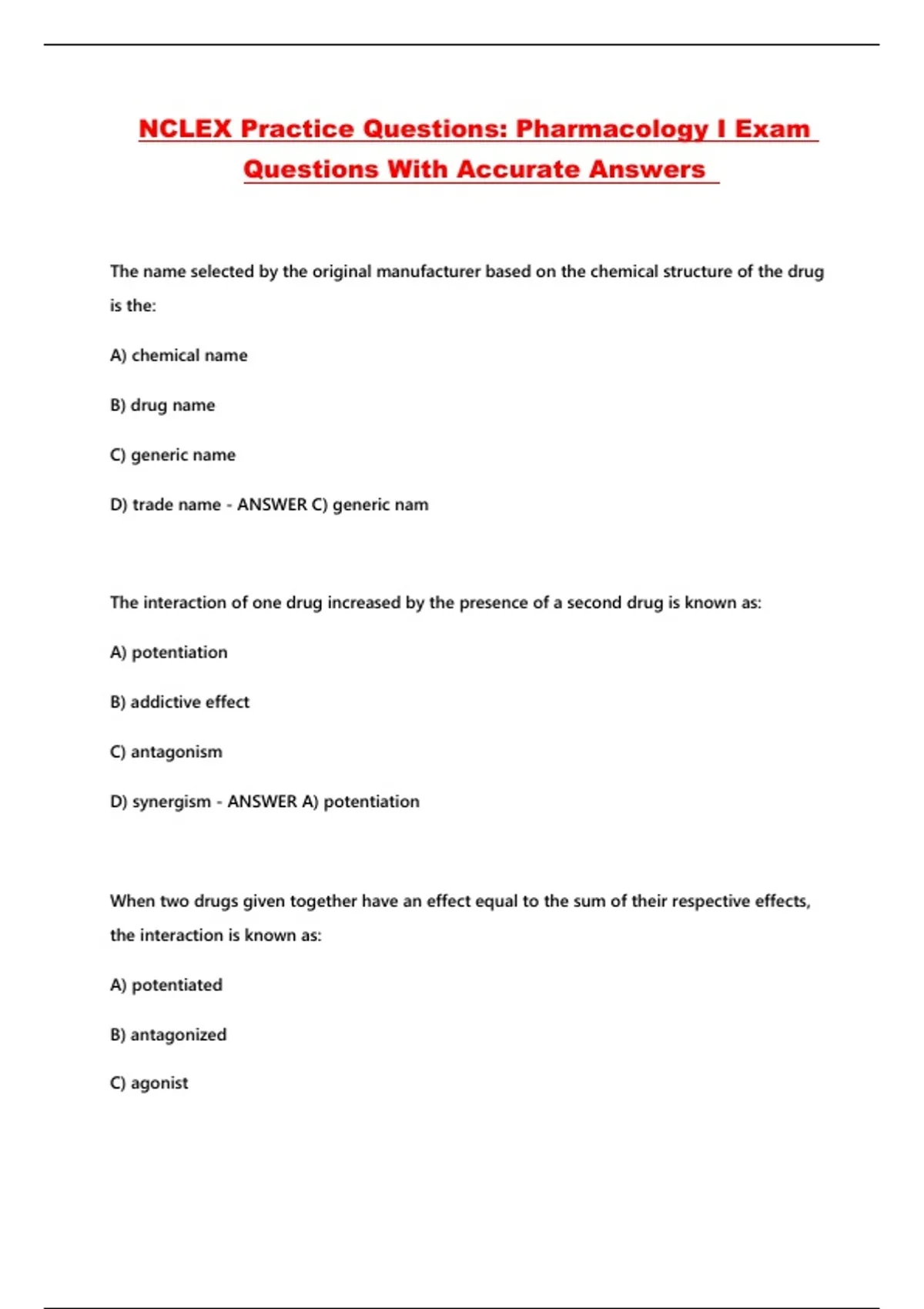 NCLEX Practice Questions: Pharmacology I Exam Questions With Accurate Answers ...