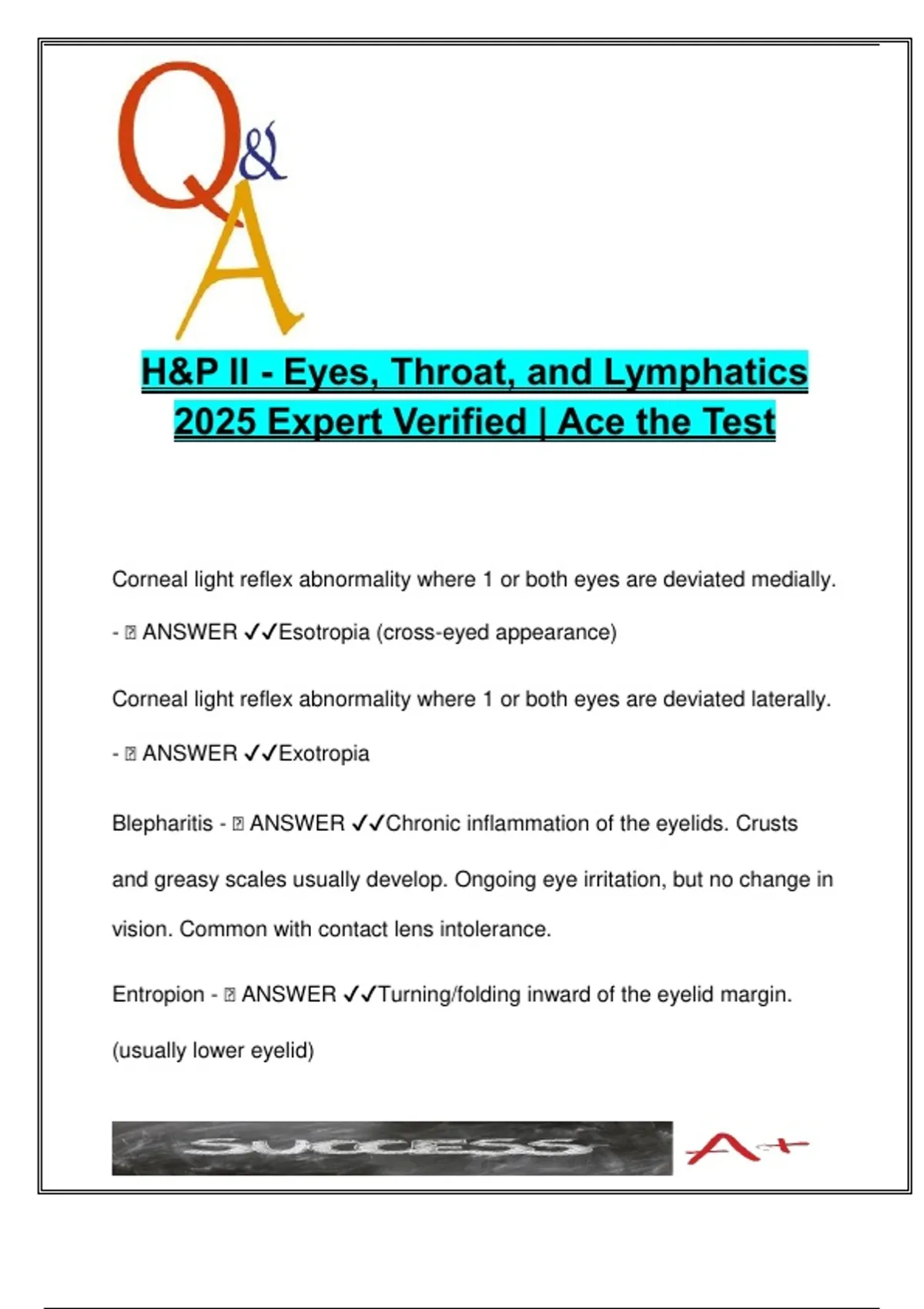 This extensive guide contains over 90 expertly verified Q&As designed for the History & Physical II (H&P II) exam, focusing on the Eyes, Throat, and Lymphatics module for the 2025 academic year. It provides detailed clinical insights into ophthalmologic conditions (e.g., glaucoma, macular degeneration, diabetic retinopathy), external eye disorders (blepharitis, hordeolum, chalazion), and ENT pathologies such as otitis media, otitis externa, tympanic membrane conditions, and lymphatic drainage patterns. Each entry clearly defines diagnostic features, physical exam findings (including fundoscopy and tympanometry), and clinical implications, making it a crucial tool for mastering both identification and interpretation of HEENT-related pathologies. Also included are key neuro-ophthalmic signs, pupillary and visual field abnormalities, hearing assessments, and systemic clues (e.g., jugular venous waveforms, meningitis signs). This document is ideal for medical, PA, and NP students preparing for clinical skills exams, OSCEs, or preclinical testing in physical diagnosis. Keywords: ophthalmology, ear disorders, glaucoma, diabetic retinopathy, macular degeneration, otitis media, chalazion, tympanic membrane, jugular venous pressure, HEENT, retinopathy, cranial nerves, fundoscopy, lymph nodes, meningitis signs