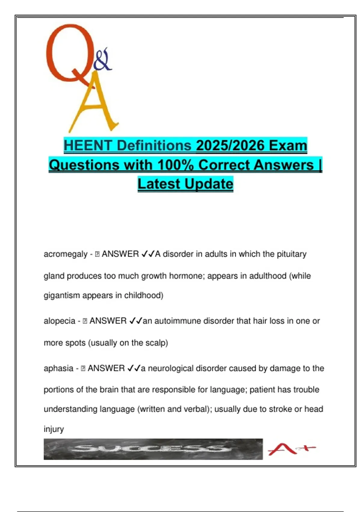 This document offers a comprehensive glossary of over 150 high-yield, exam-ready definitions relevant to the HEENT (Head, Eyes, Ears, Nose, Throat) system for the 2025/2026 academic year. It provides clear, concise explanations across a wide range of topics including neuroanatomy (e.g., aphasia, ataxia, CN disorders), dermatologic lesions (e.g., macules, pustules, lichenification), ENT pathologies (e.g., tinnitus, vertigo, otitis, turbinates), eye disorders (e.g., glaucoma, strabismus, papilledema), and systemic signs (e.g., cachexia, goiter, lymphadenopathy). Definitions are clinically relevant and often include contextual details such as common causes, associated symptoms, or diagnostic considerations (e.g., Tzanck test, Weber/Rinne test, AV nicking). This guide is indispensable for medical, PA, and NP students preparing for physical exam assessments, OSCEs, or theory-based exams involving HEENT systems. It is also ideal for rapid reference or pre-clinical concept reinforcement. Keywords: HEENT, medical definitions, aphasia, glaucoma, lymphadenopathy, vertigo, ear disorders, cranial nerves, dermatologic lesions, optic disc, oral pathologies, tympanic membrane, skin terms, physical diagnosis