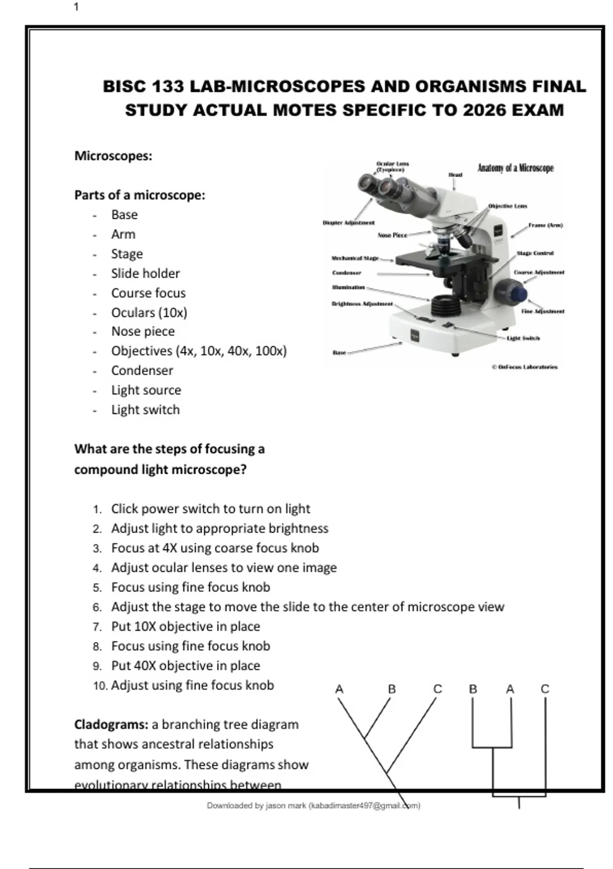 This course provides a targeted laboratory review for BISC 133, focusing on microscopes and microorganisms in preparation for the 2026 final examination. Topics include microscope types and techniques, specimen preparation, microbial morphology, staining methods, and identification of bacteria, fungi, and protists. The guide incorporates actual exam-specific notes to strengthen observational skills, practical laboratory competence, and accurate identification of microorganisms.