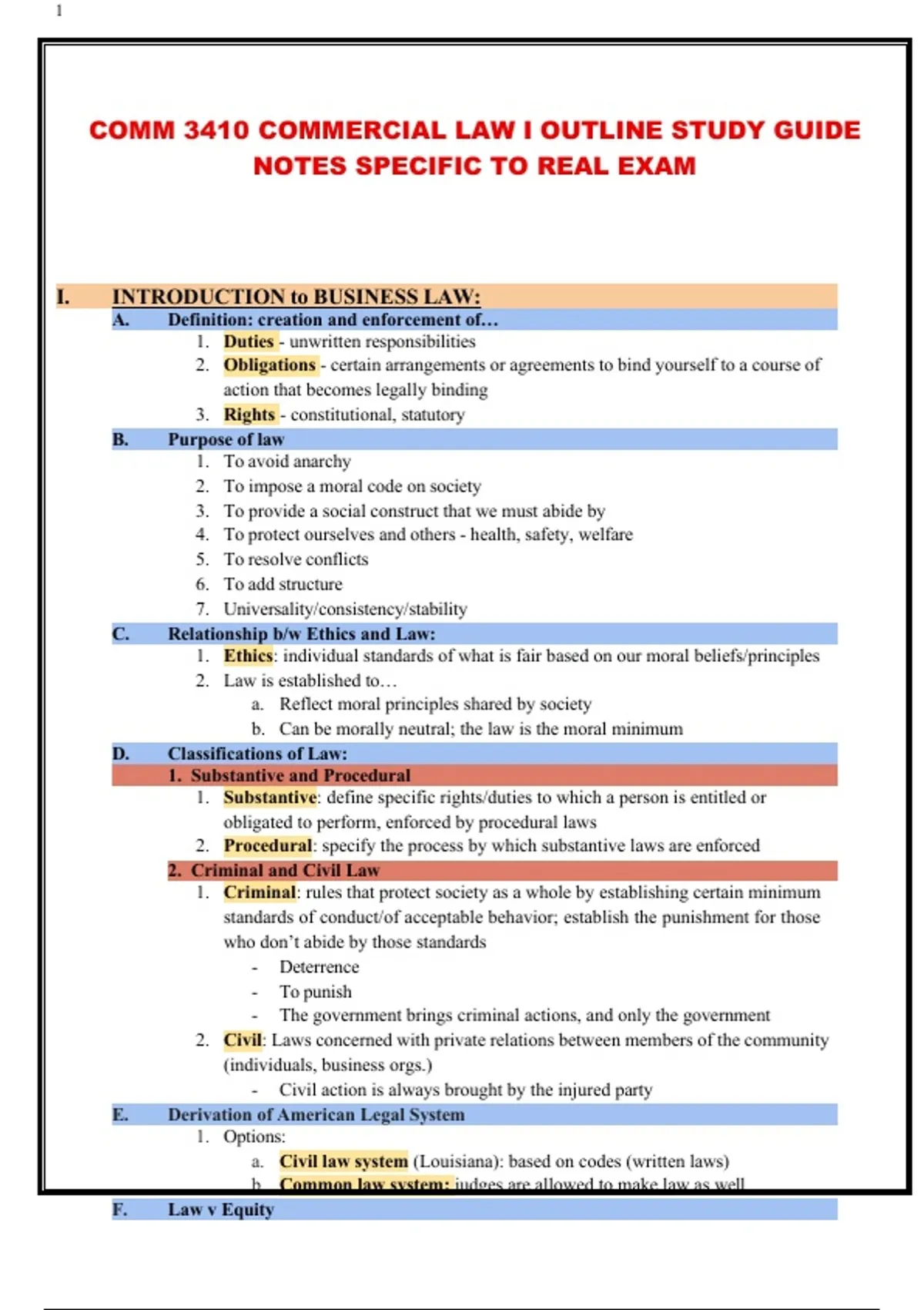 COMM 3410 COMMERCIAL LAW I OUTLINE STUDY GUIDE