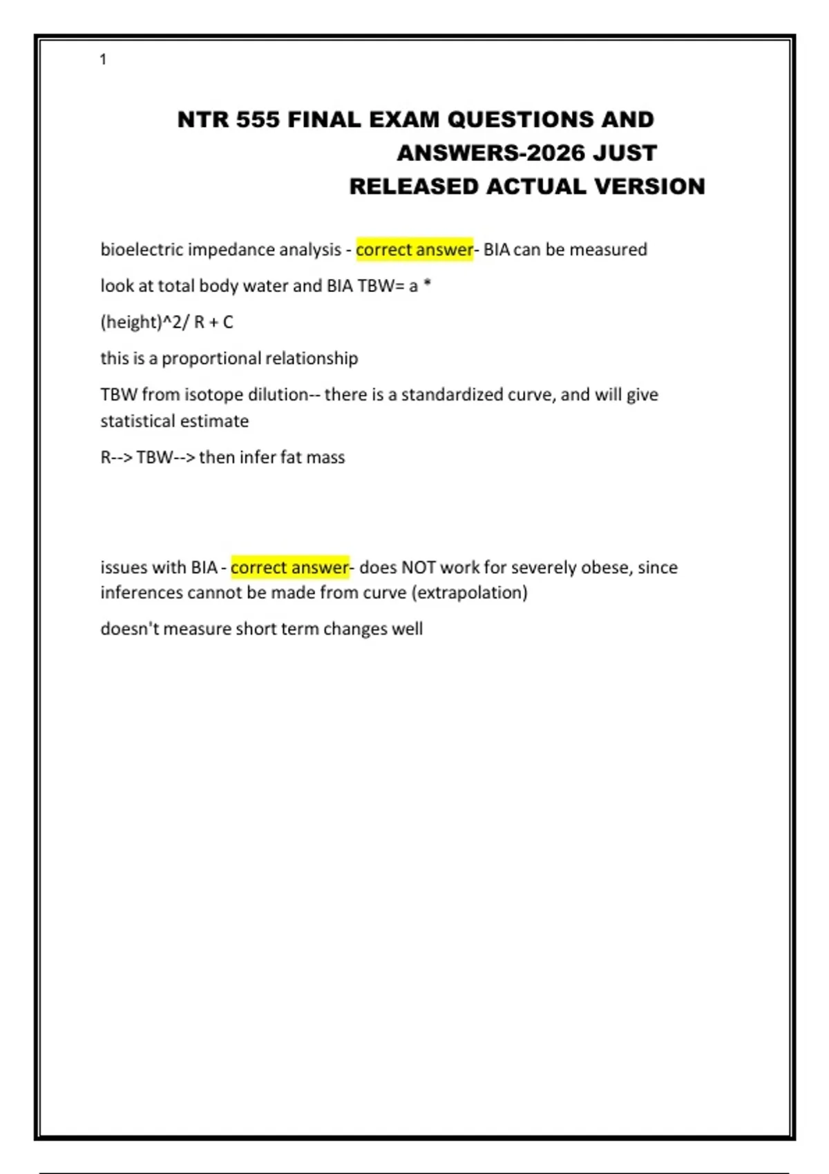 bioelectric impedance analysis - correct answer- BIA can be measured