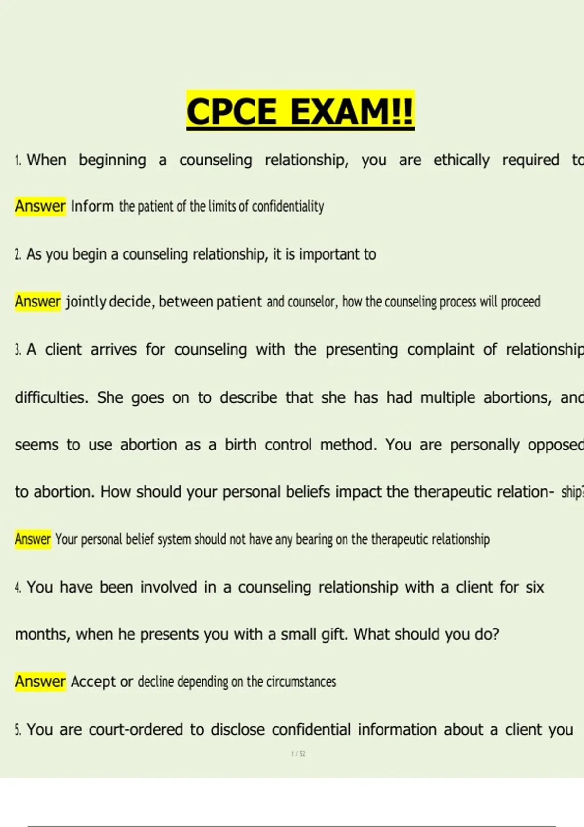 This document is a comprehensive and fully solved CPCE (Counselor Preparation Comprehensive Examination) practice exam, designed to support graduate-level counseling students preparing for the CPCE and related comprehensive or exit examinations. It includes an extensive set of exam-style questions with correct answers covering all major CACREP-aligned content areas, such as professional ethics and legal issues, counseling theories, human growth and development, multicultural counseling, group counseling dynamics, assessment and testing, research methods, and career counseling theories. The material also provides in-depth coverage of psychopathology and diagnosis, including mood disorders, anxiety disorders, personality disorders, schizophrenia spectrum disorders, substance use disorders, and suicide risk, as well as key figures and experiments in psychology. This resource is ideal for CPCE preparation, comprehensive exams, counselor education review, and reinforcing theoretical and practical knowledge required for success in counseling programs.