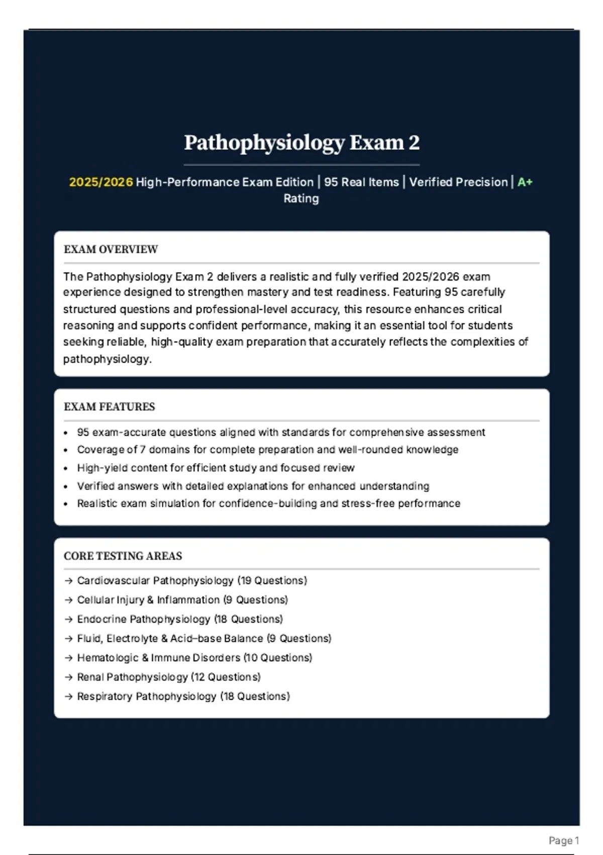 This resource provides the true 2025/2026 Pathophysiology Exam 2 with 95 real exam-style questions and verified answers. Covers seven critical domains: cardiovascular pathophysiology, cellular injury & inflammation, endocrine disorders, fluid/electrolyte & acid-base balance, hematologic & immune disorders, renal pathophysiology, and respiratory pathophysiology. Designed to simulate the actual exam, ensuring accuracy, confidence, and readiness for success in advanced pathophysiology.
