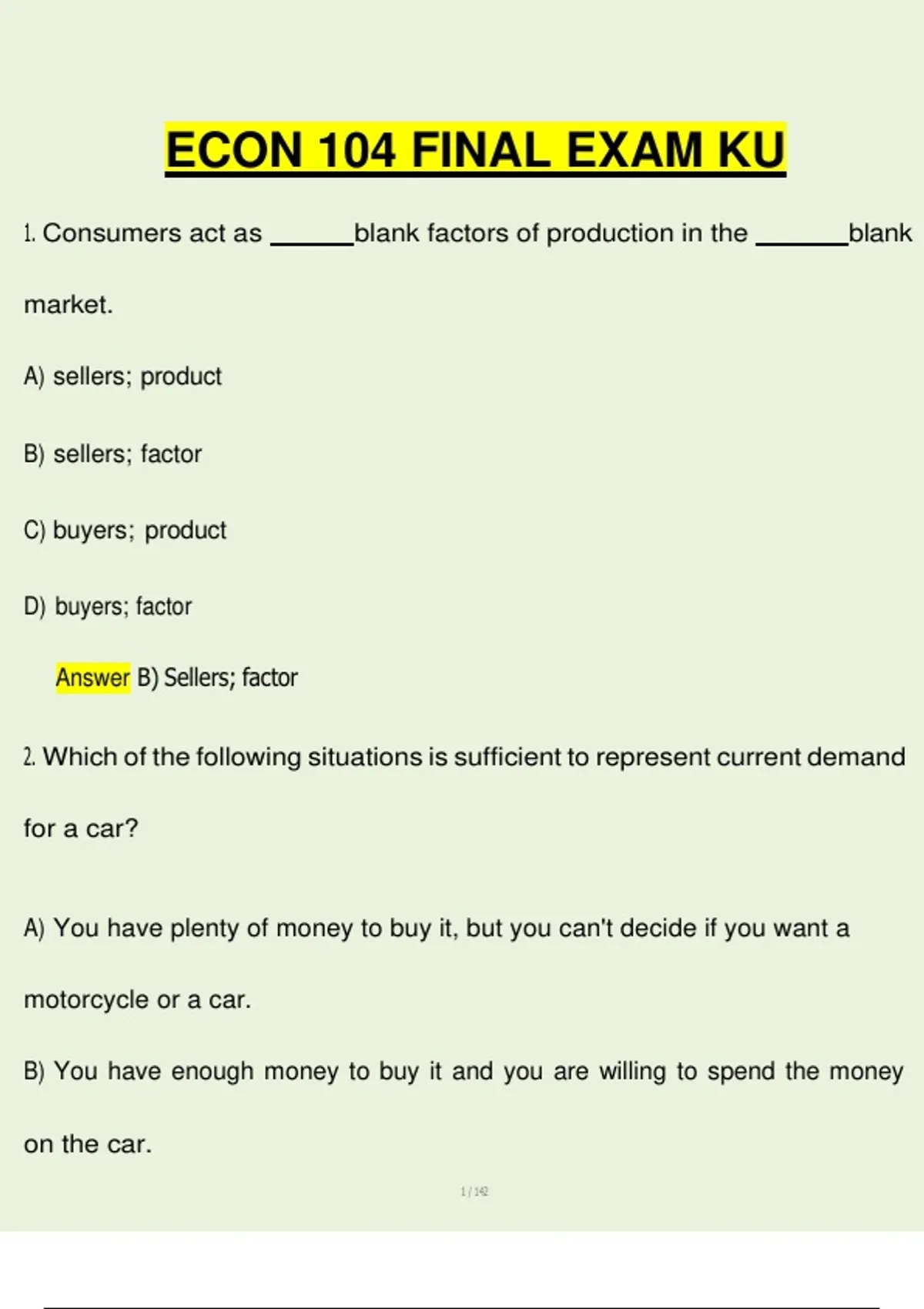 This document is a comprehensive and fully solved final exam resource for ECON 104 (Principles of Macroeconomics), specifically aligned with the KU final exam format. It contains an extensive set of exam-style multiple-choice questions with verified correct answers covering foundational microeconomic and macroeconomic principles, including supply and demand analysis, market equilibrium, price controls, elasticity concepts, and consumer and producer behavior. The material also provides in-depth coverage of market structures (perfect competition, monopolistic competition, oligopoly, monopoly), firm cost curves, profit maximization, marginal analysis, barriers to entry, and real-world applications of competition and monopoly power. In addition, it thoroughly reviews macroeconomic topics such as aggregate demand and aggregate supply, fiscal policy, multipliers, GDP gaps, inflation, unemployment, Keynesian theory, money and banking, the Federal Reserve, money creation, and monetary functions. This resource is ideal for final exam preparation, cumulative review, and mastering high-yield concepts tested in ECON 104.