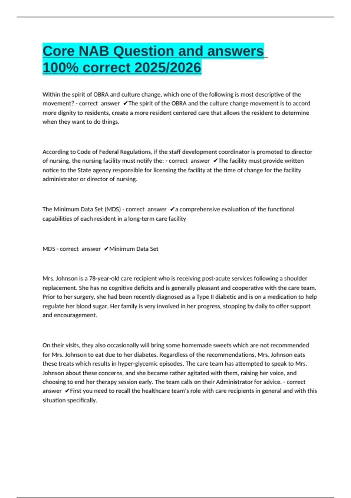 Core NAB Question and answers 100% correct 2025/2026 Within the spirit of OBRA and culture change, which one of the following is most descriptive of the movement? - correct answer The spirit of the OBRA and the culture change movement is to accord more dignity to residents, create a more resident centered care that allows the resident to determine when they want to do things. According to Code of Federal Regulations, if the staff development coordinator is promoted to director of nursing, the nursing facility must notify the: - correct answer The facility must provide written notice to the State agency responsible for licensing the facility at the time of change for the facility administrator or director of nursing. The Minimum Data Set (MDS) - correct answer a comprehensive evaluation of the functional capabilities of each resident in a lo