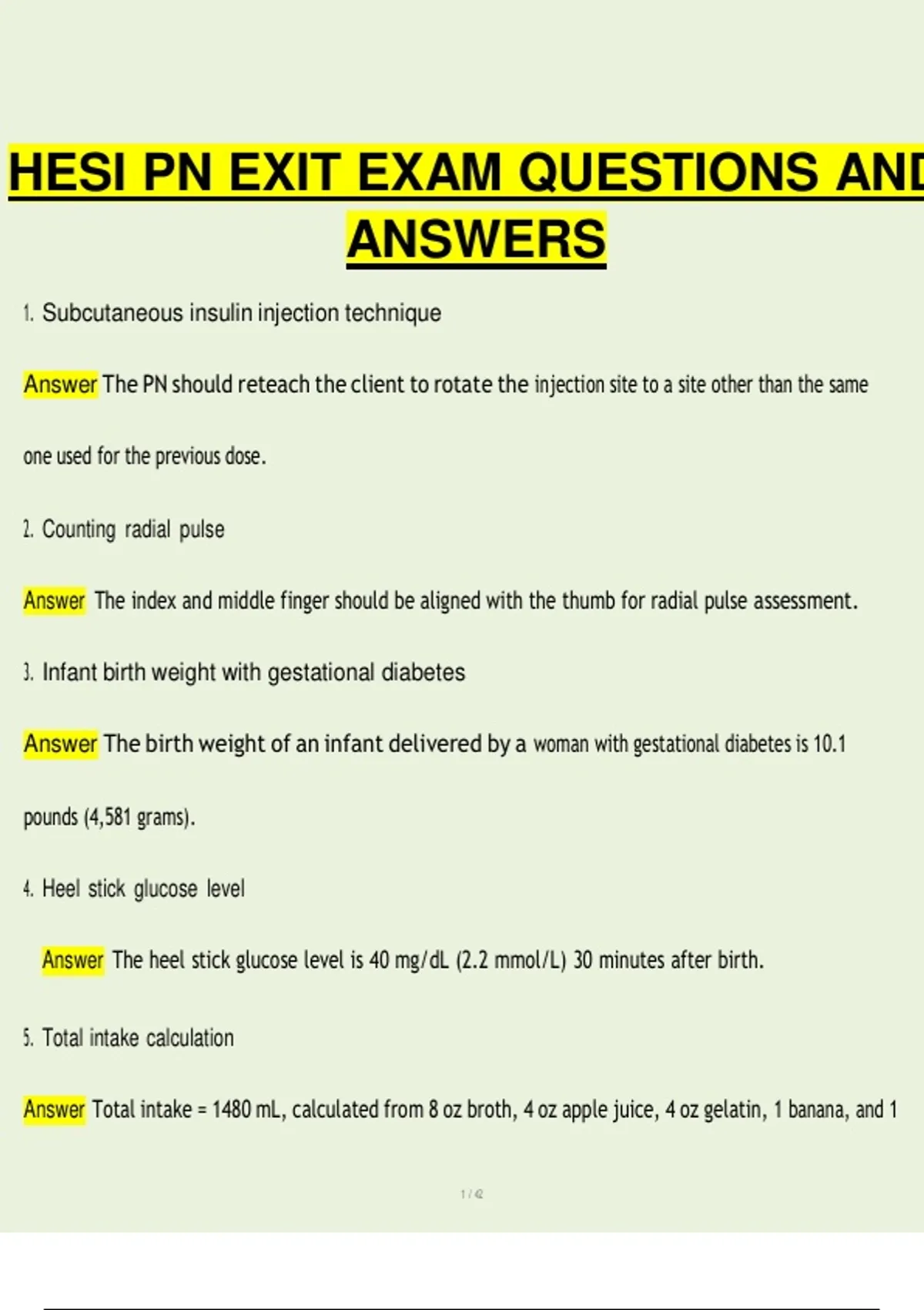 This document is a comprehensive and fully solved HESI PN Exit Exam study guide, created to support practical nursing (PN/LPN) students preparing for their program exit exam and HESI assessment. It contains an extensive collection of exam-style questions with clear, verified answers covering core nursing responsibilities, prioritization, client safety, scope of practice, communication, documentation, and clinical decision-making. The material provides in-depth review across all major nursing domains, including fundamentals of nursing care, medical-surgical nursing, pharmacology, infection control, fluid and electrolyte balance, cardiovascular and respiratory disorders, endocrine conditions, gastrointestinal and renal care, wound care, pain management, and emergency response. It also includes strong coverage of pediatrics, maternity and newborn care, mental health nursing, geriatric considerations, ethical and legal issues, and patient education, making it an ideal all-in-one resource for HESI PN exit exam success.