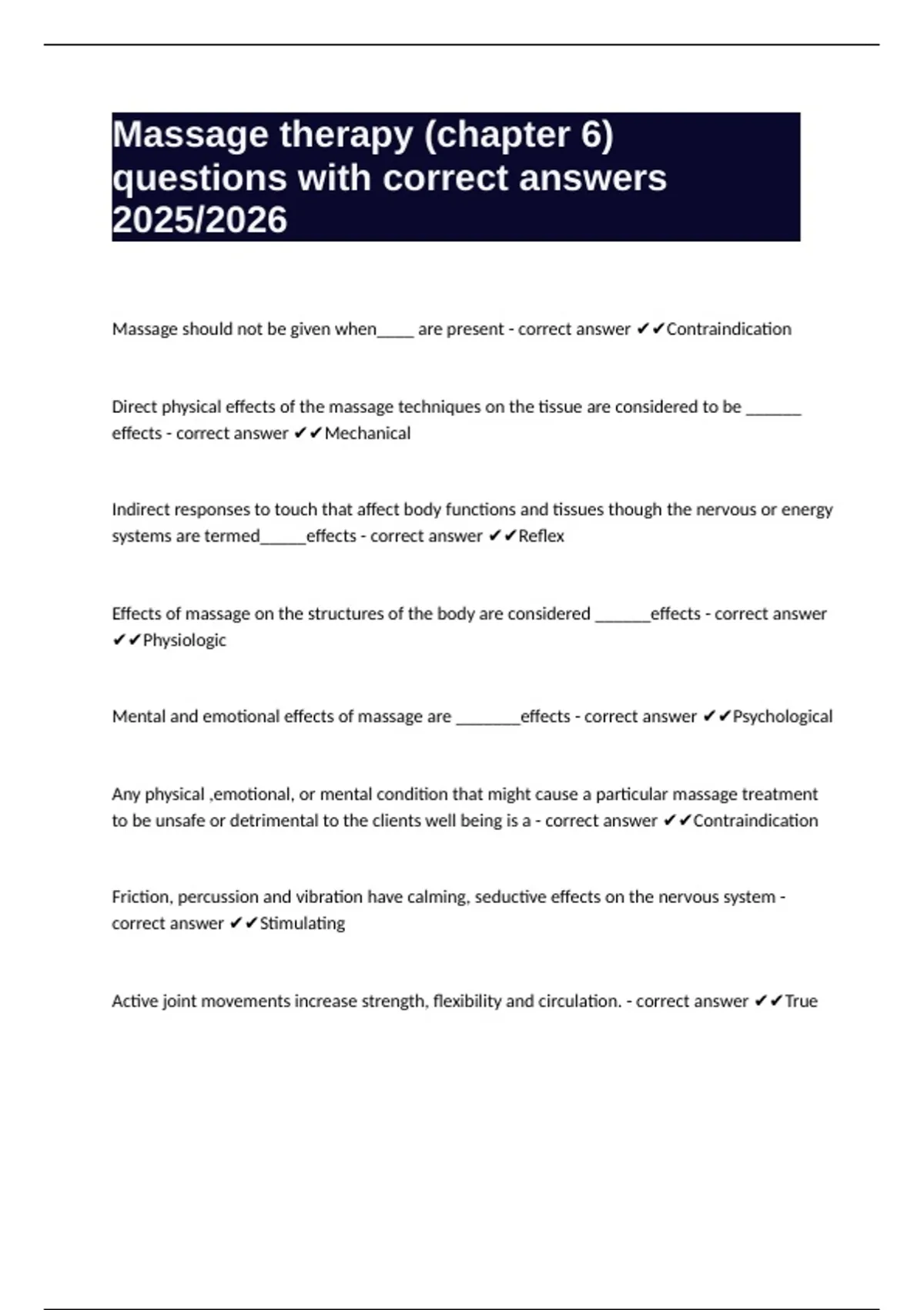 Mental and emotional effects of massage are _______effects - correct answer ✔✔Psychological